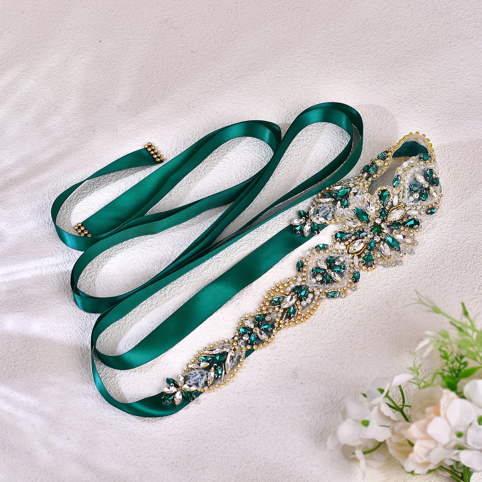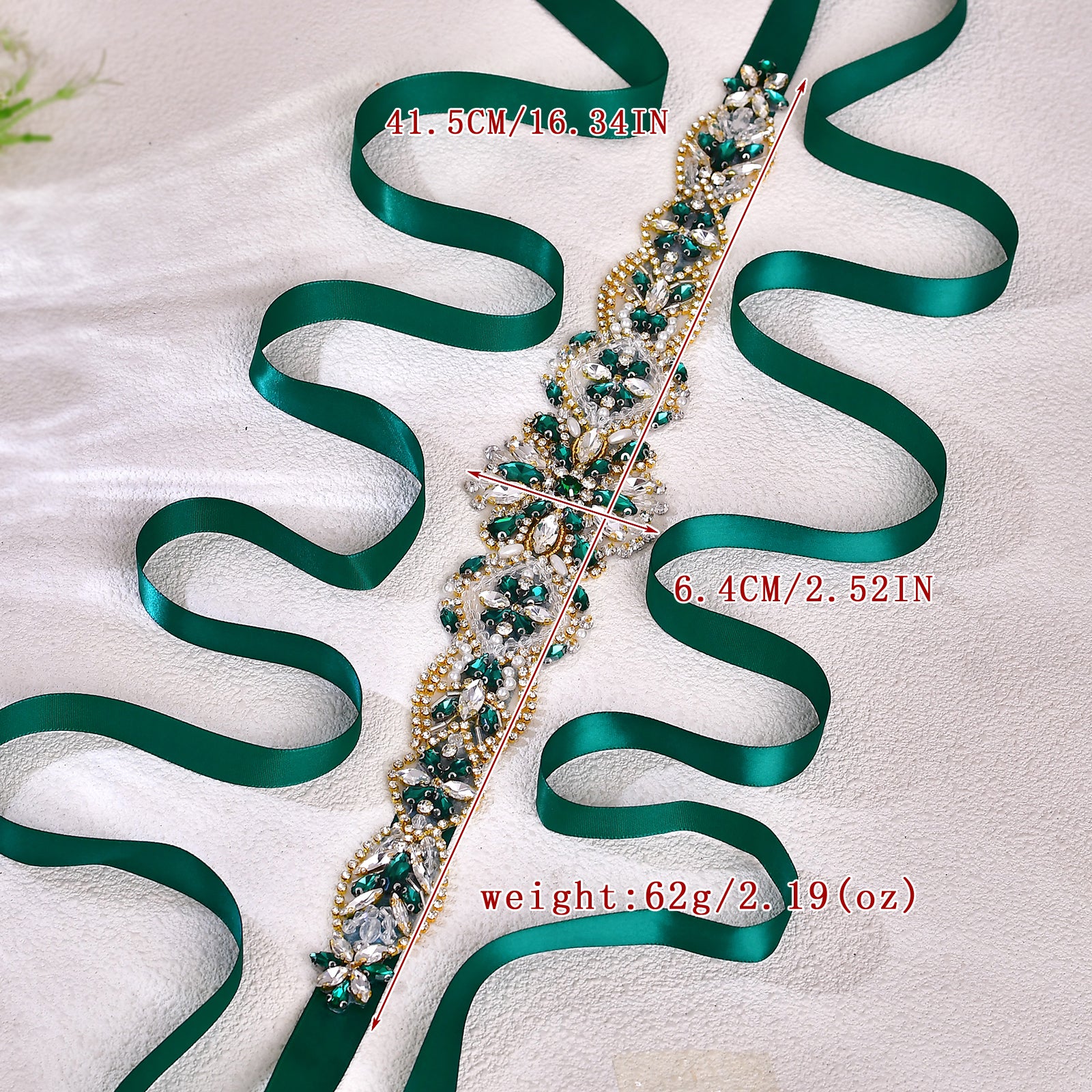 BRIDELLA BS433GKL Beautiful Widened Gold Green Contrasting Glass Diamond Skirt Waist Accessory Hand Sewn