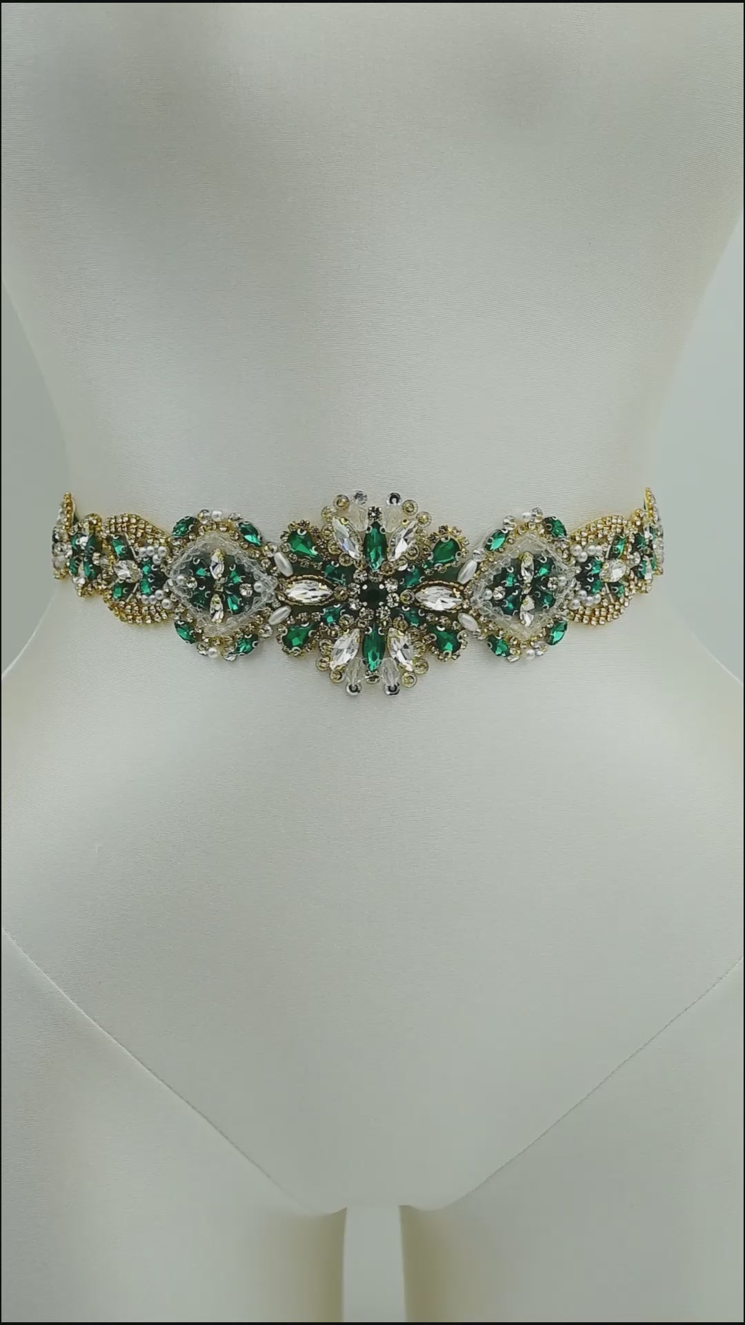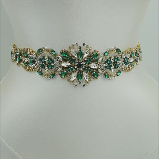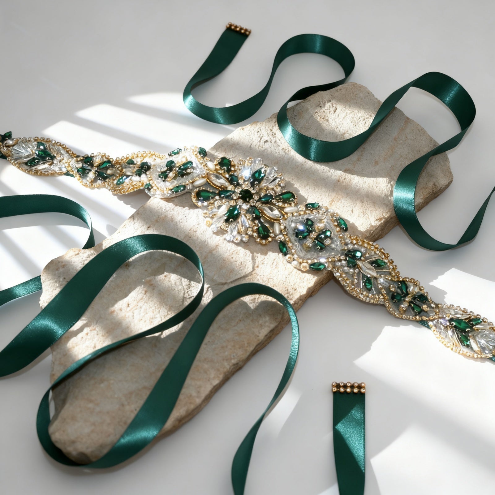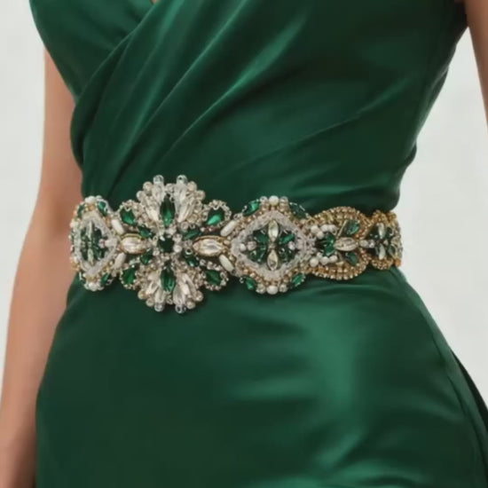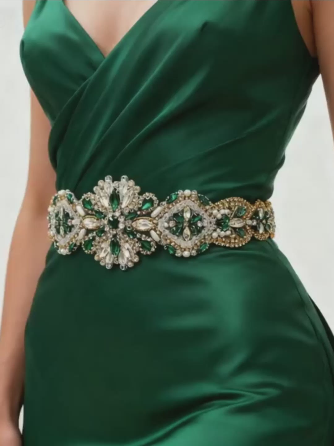 Elevate your look with this green rhinestone and pearl accessory, perfect for weddings, proms, and special occasions.