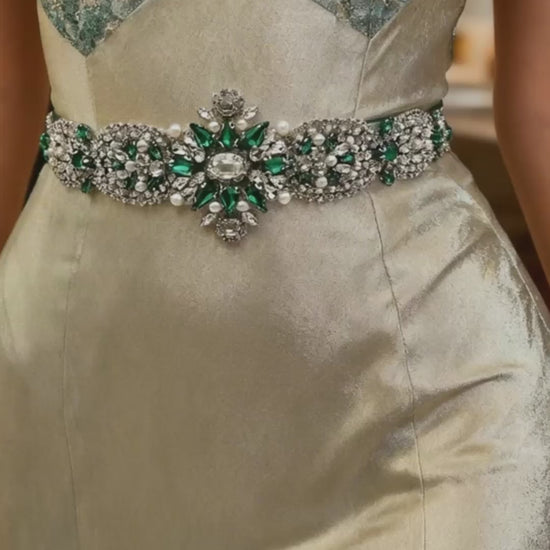 Elevate your look with this green rhinestone and pearl belt, perfect for weddings, proms, and special occasions.