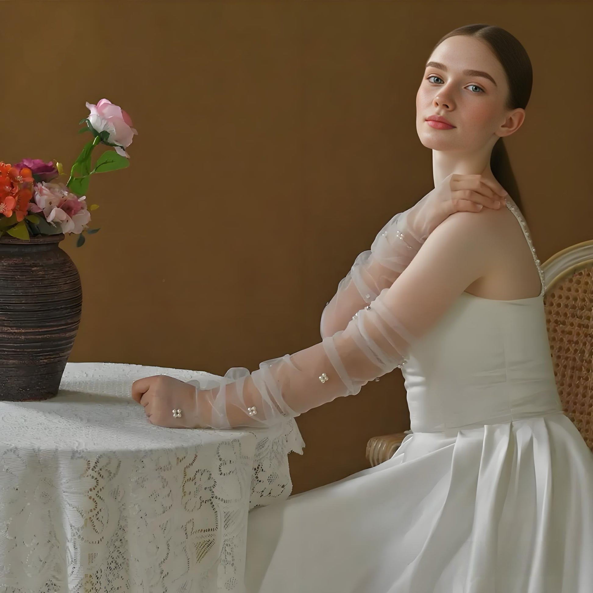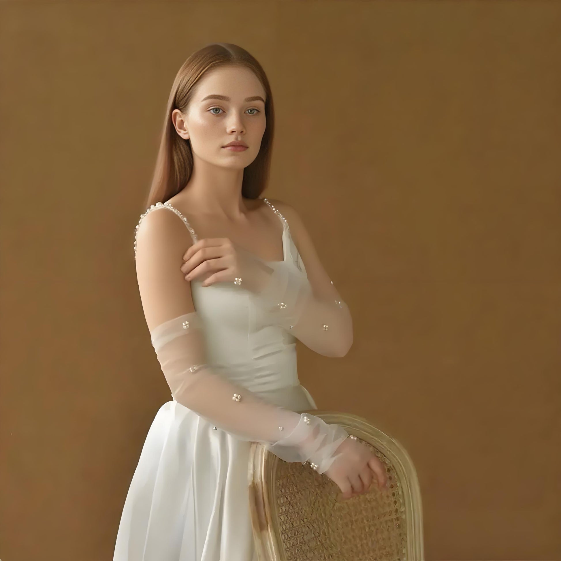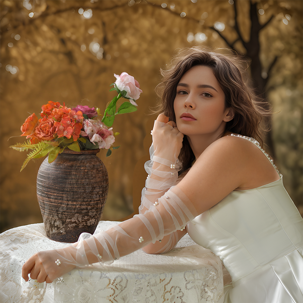 BRIDELLA BG35 Bridal Gloves Long Transparent Mesh Pearl Gloves Exquisite Rhinestone Embellished Wedding Gloves