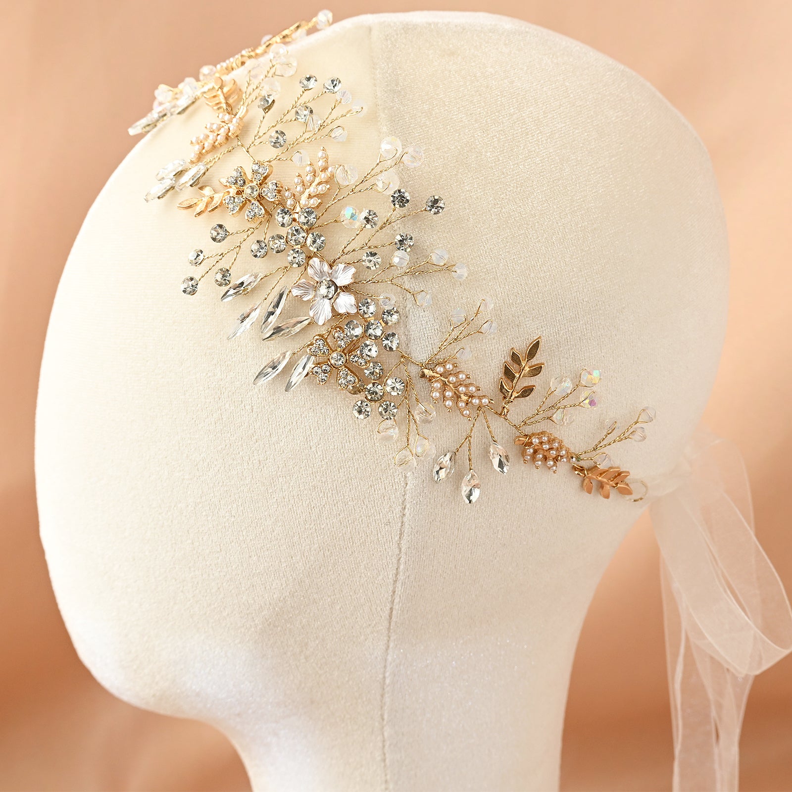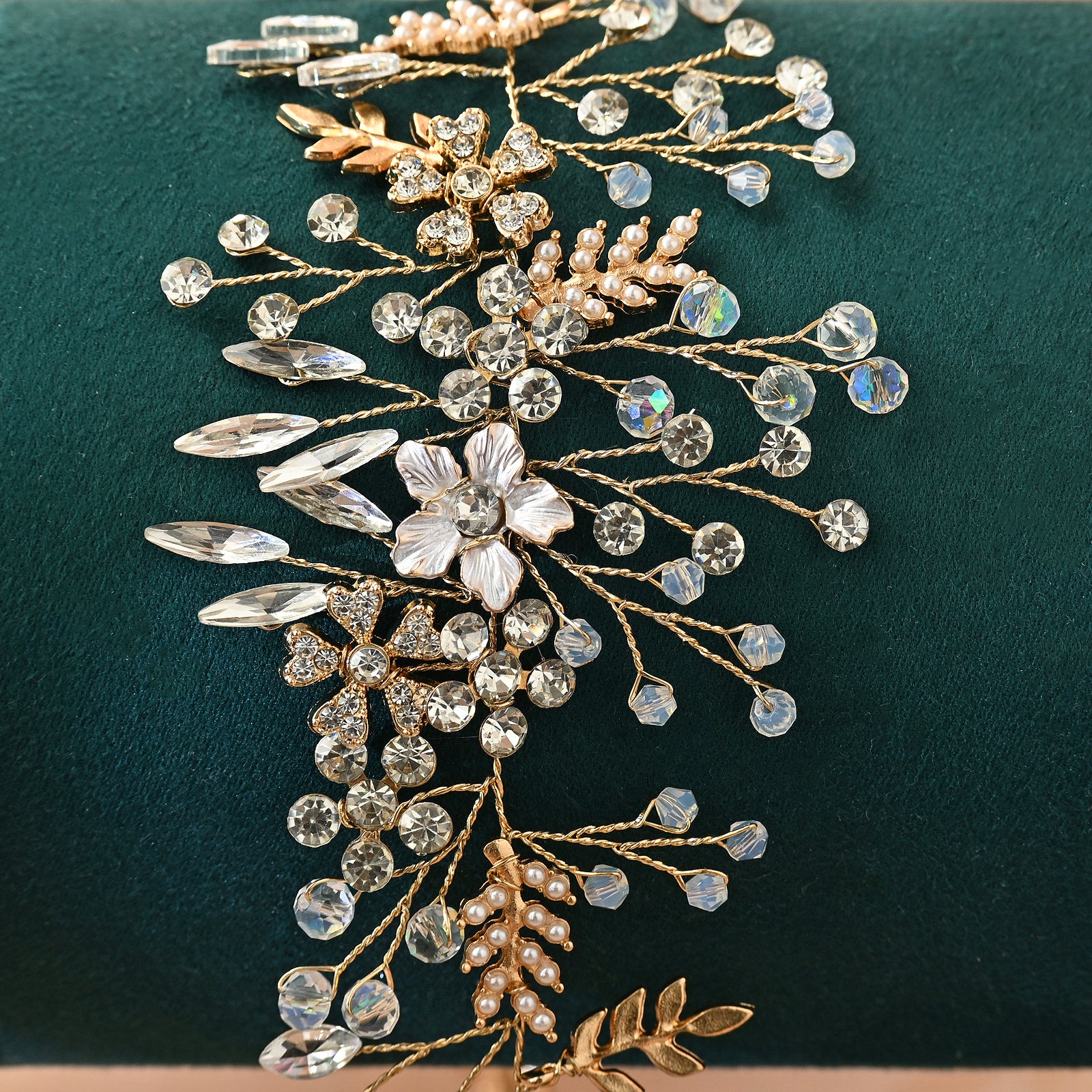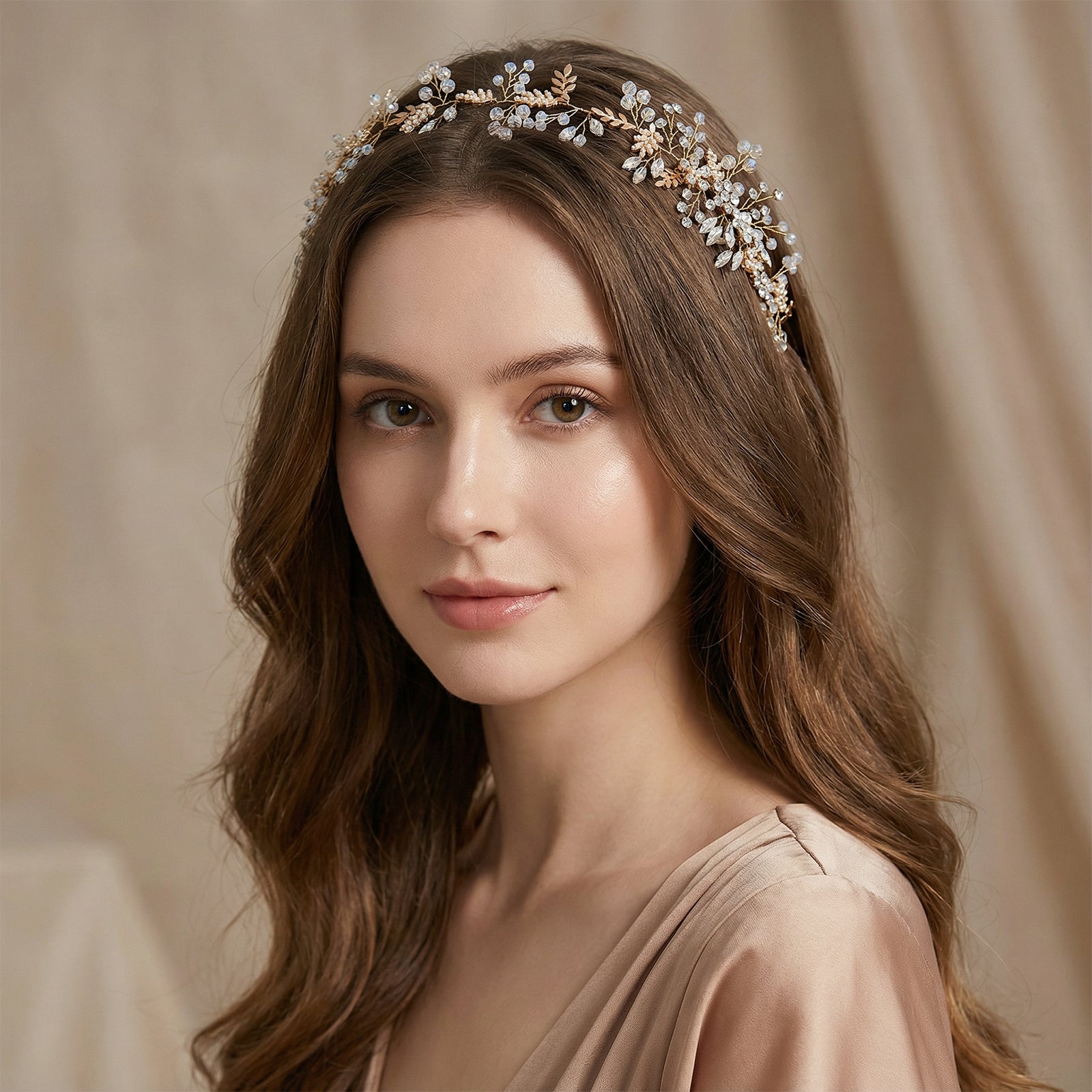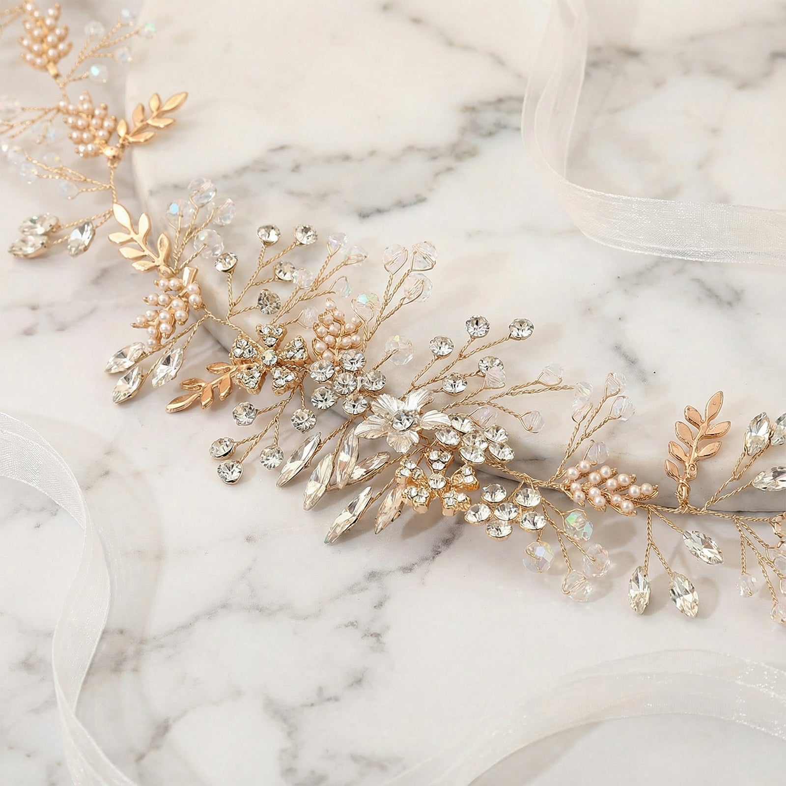 Elevate your look with this gold rhinestone and pearl headband, perfect for weddings, proms, and special occasions.