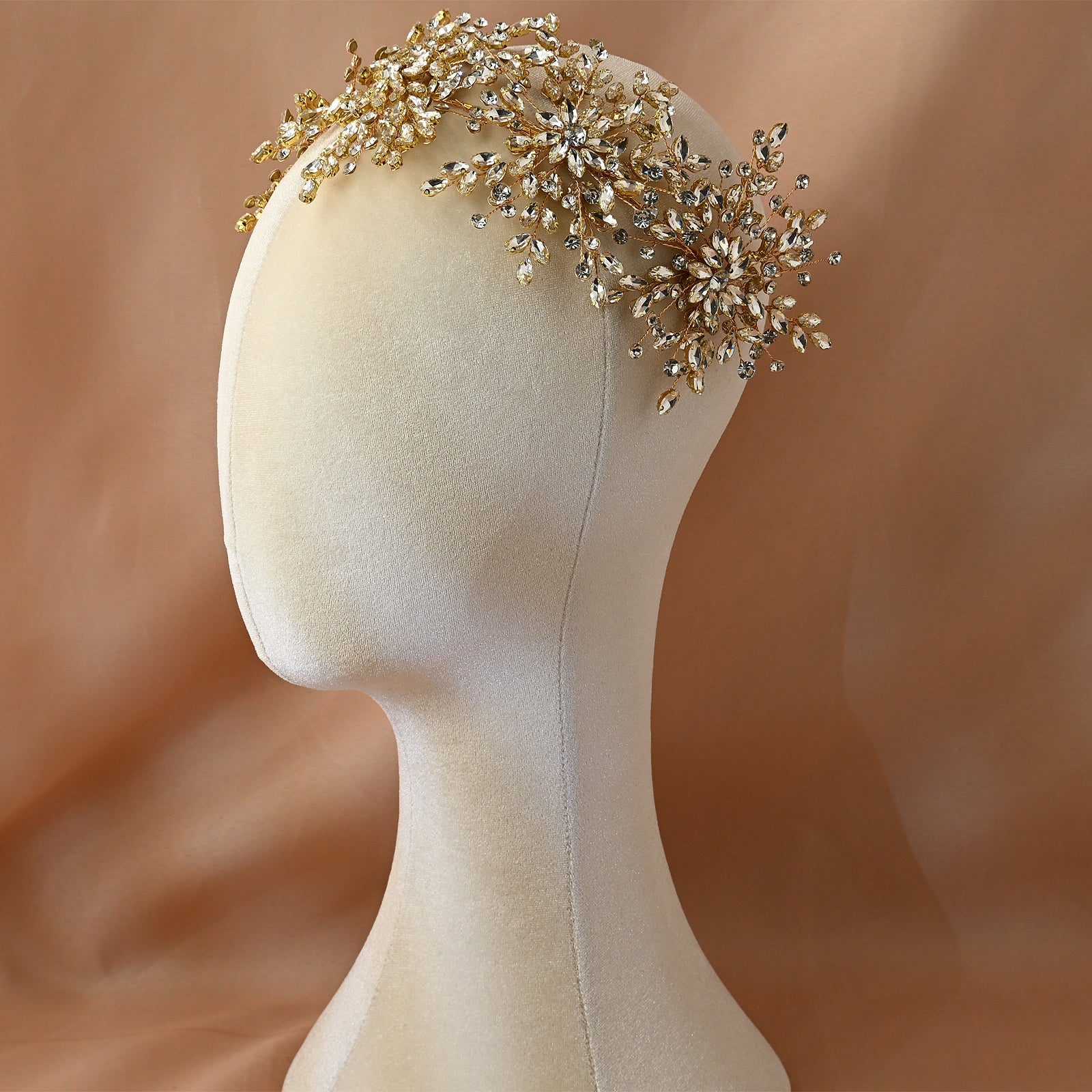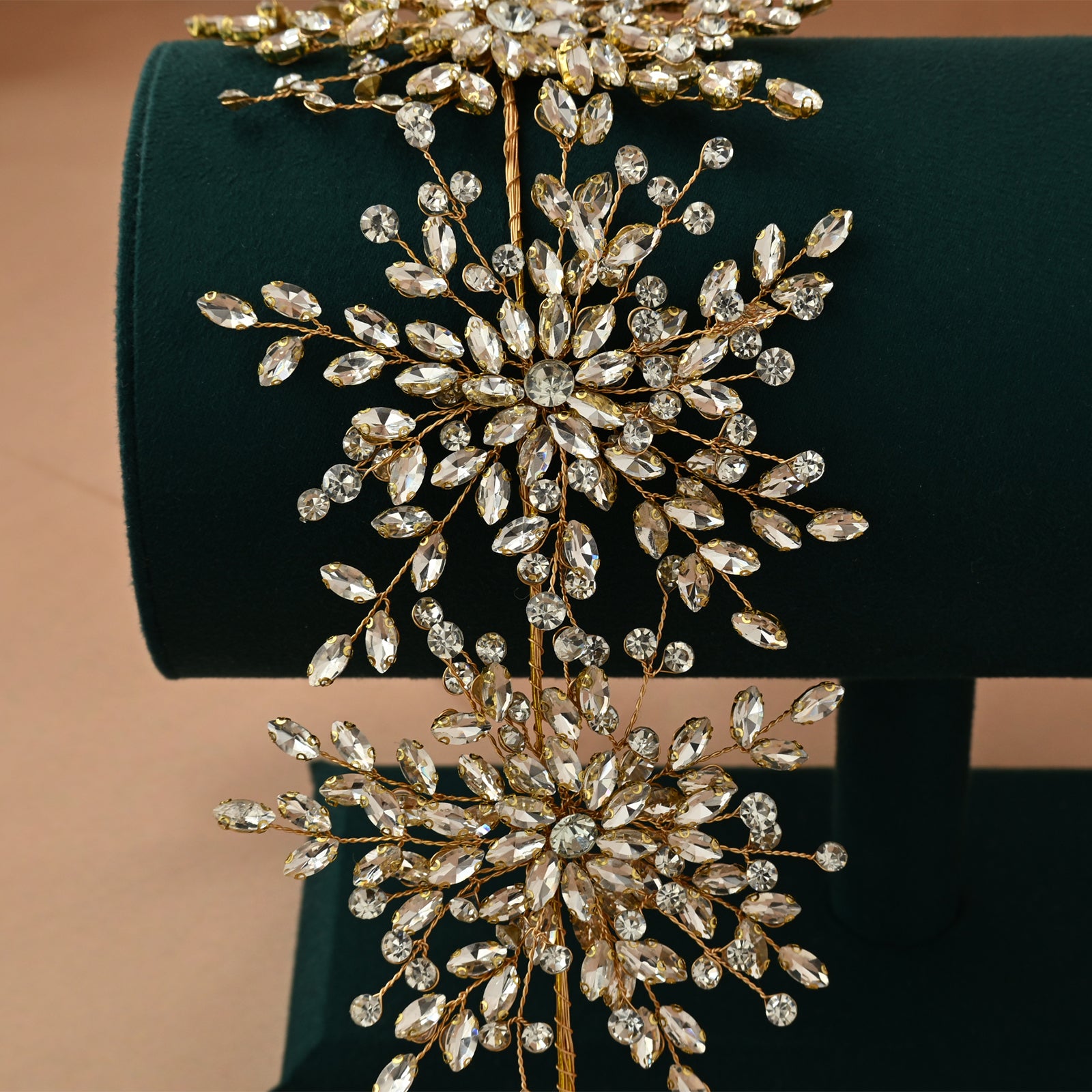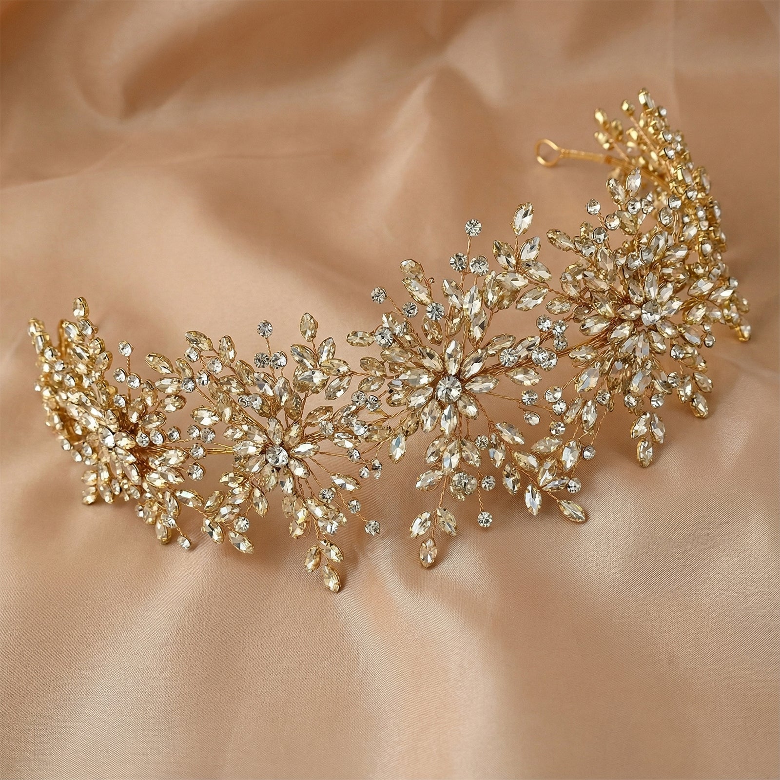 Elevate your look with this gold rhinestone crown, perfect for weddings, proms, and special occasions.