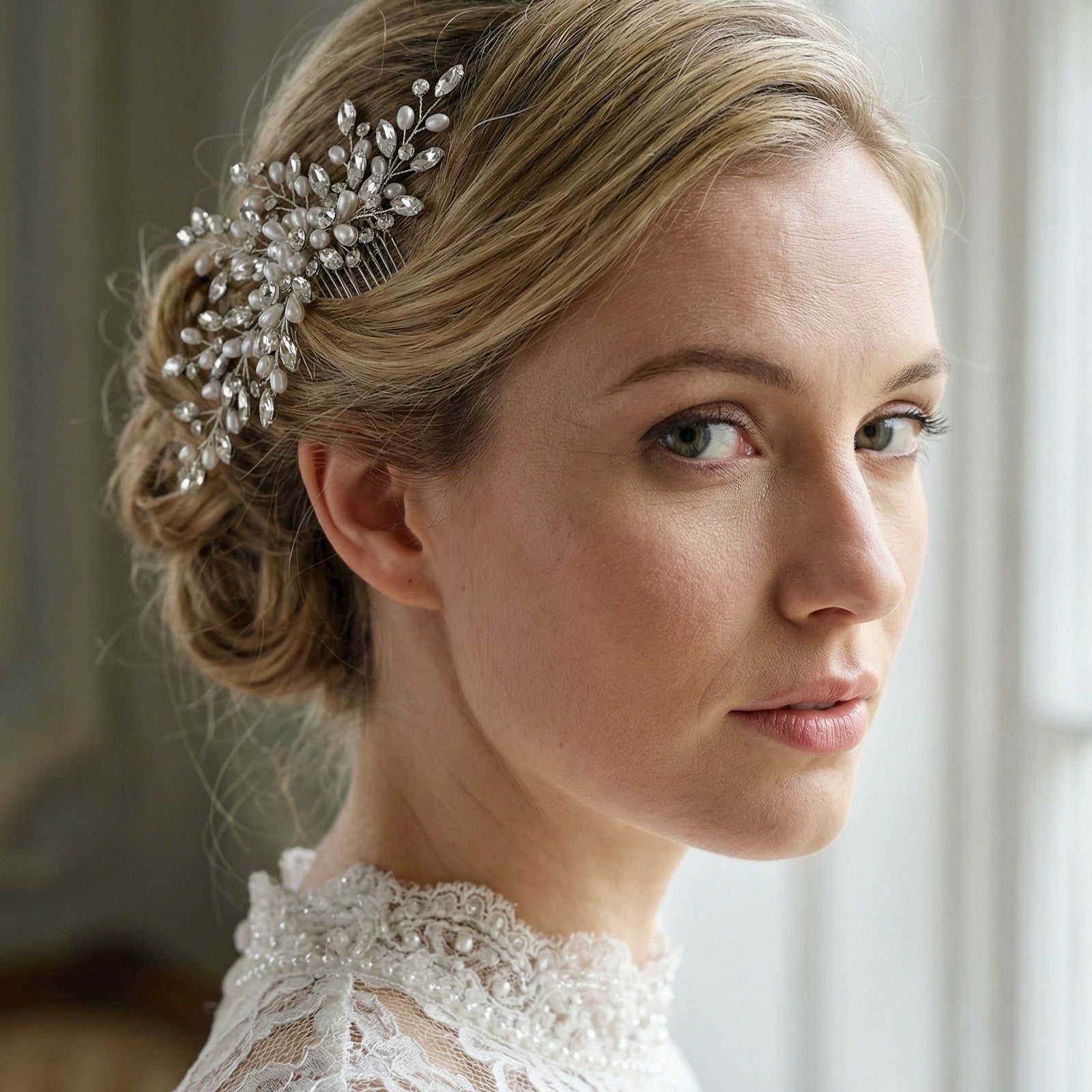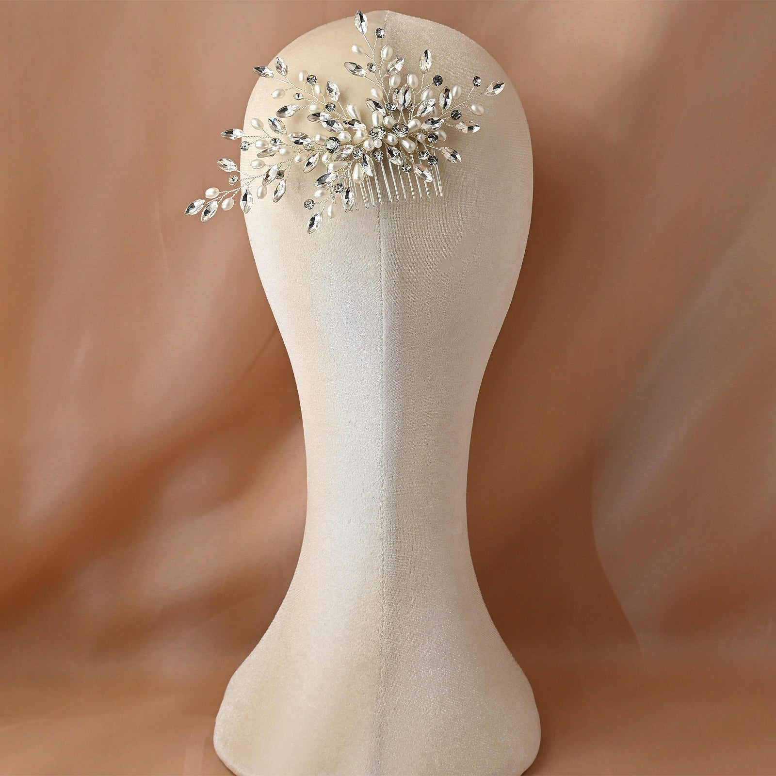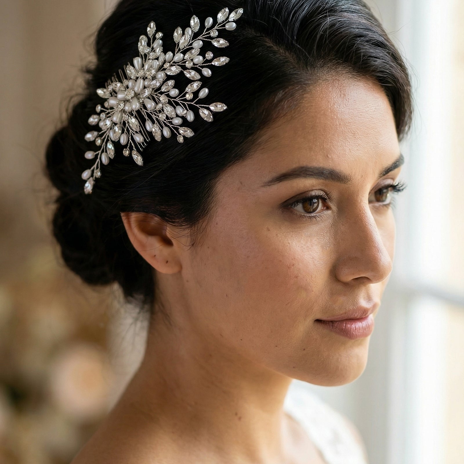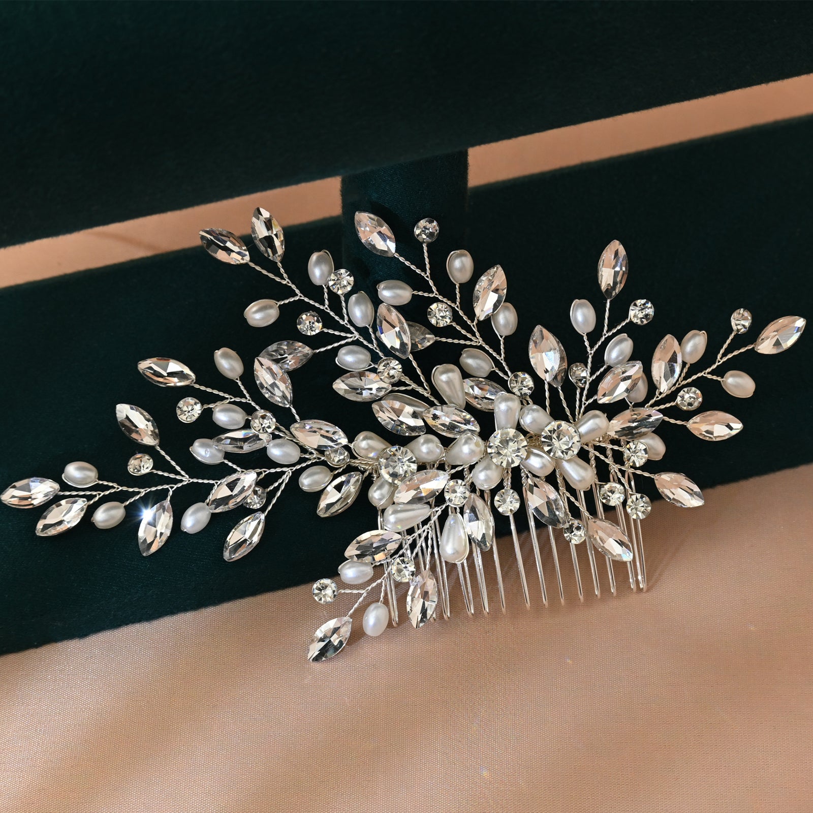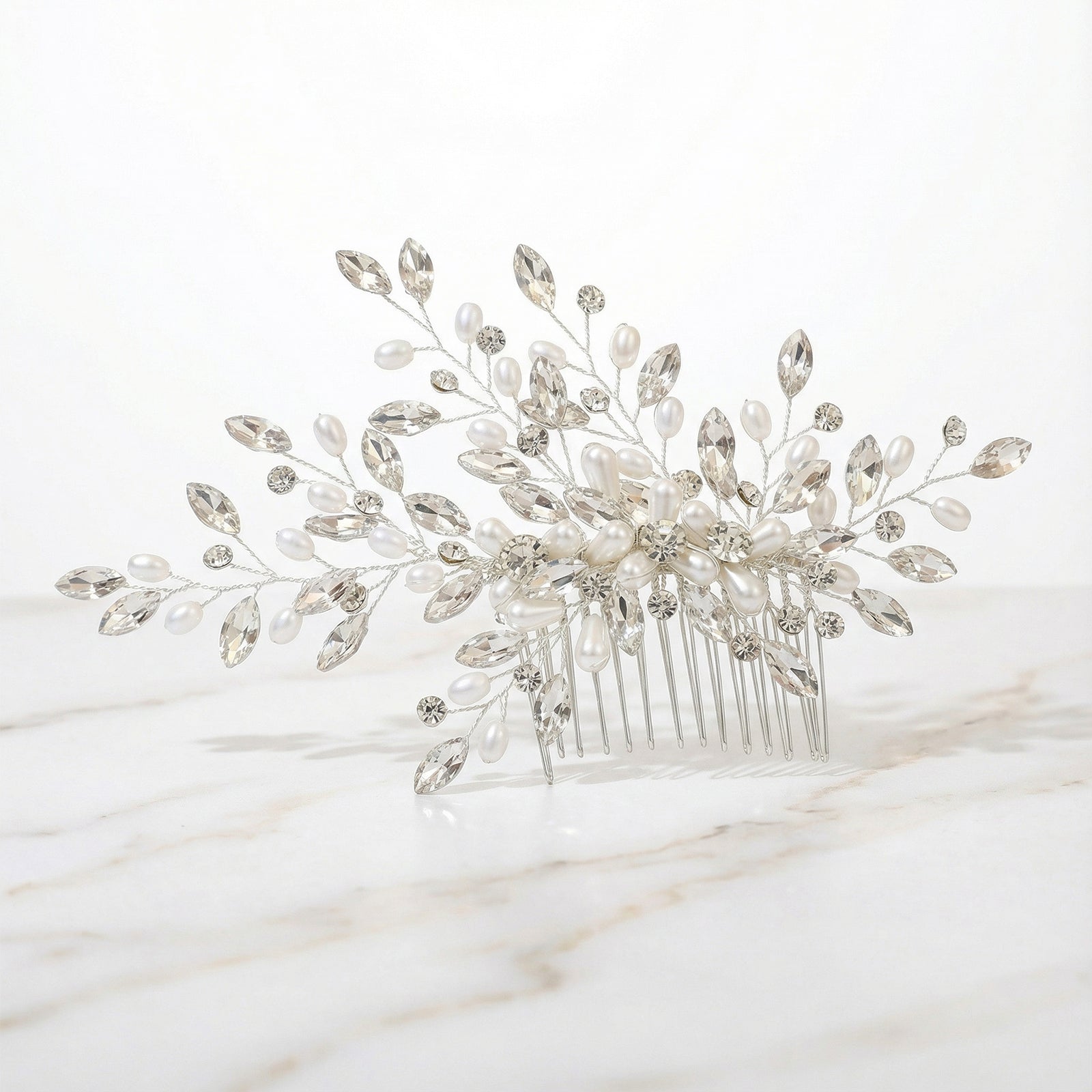 Elevate your look with this silver rhinestone and pearl tiara, perfect for weddings, proms, and special occasions.