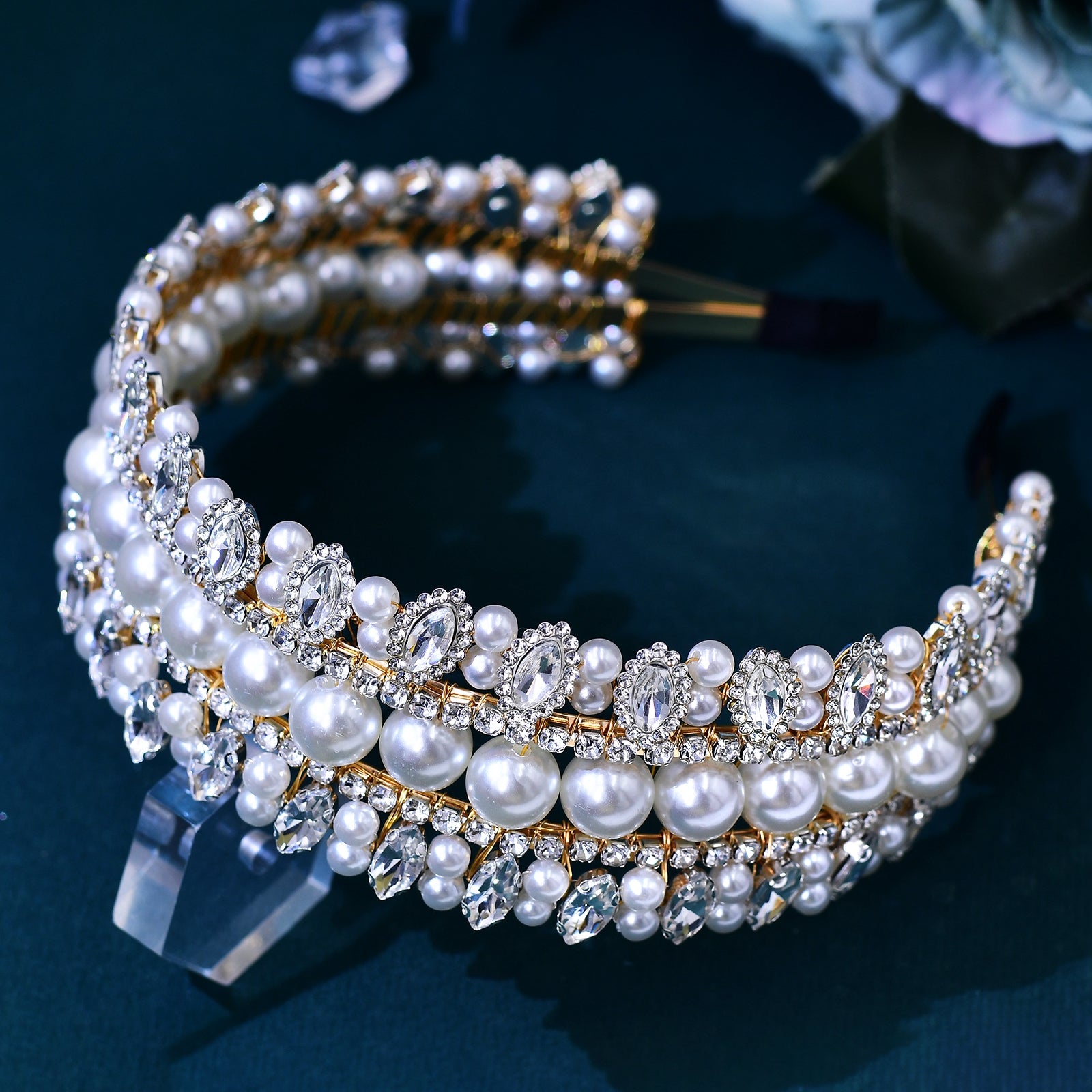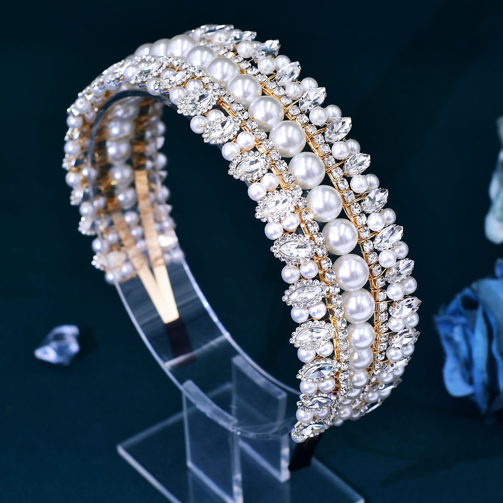 BRIDELLA BHP631 Bridal Headband with Pearls Rhinestone Woman Wedding Beaded Hair Accessories Luxury Gemstone Bridesmaid Headwear