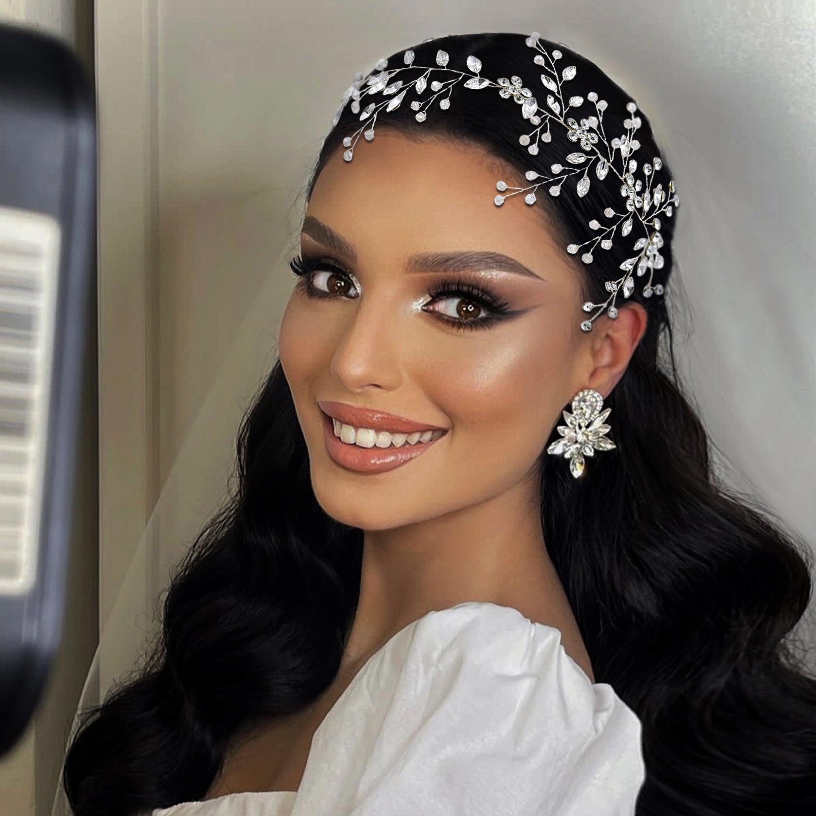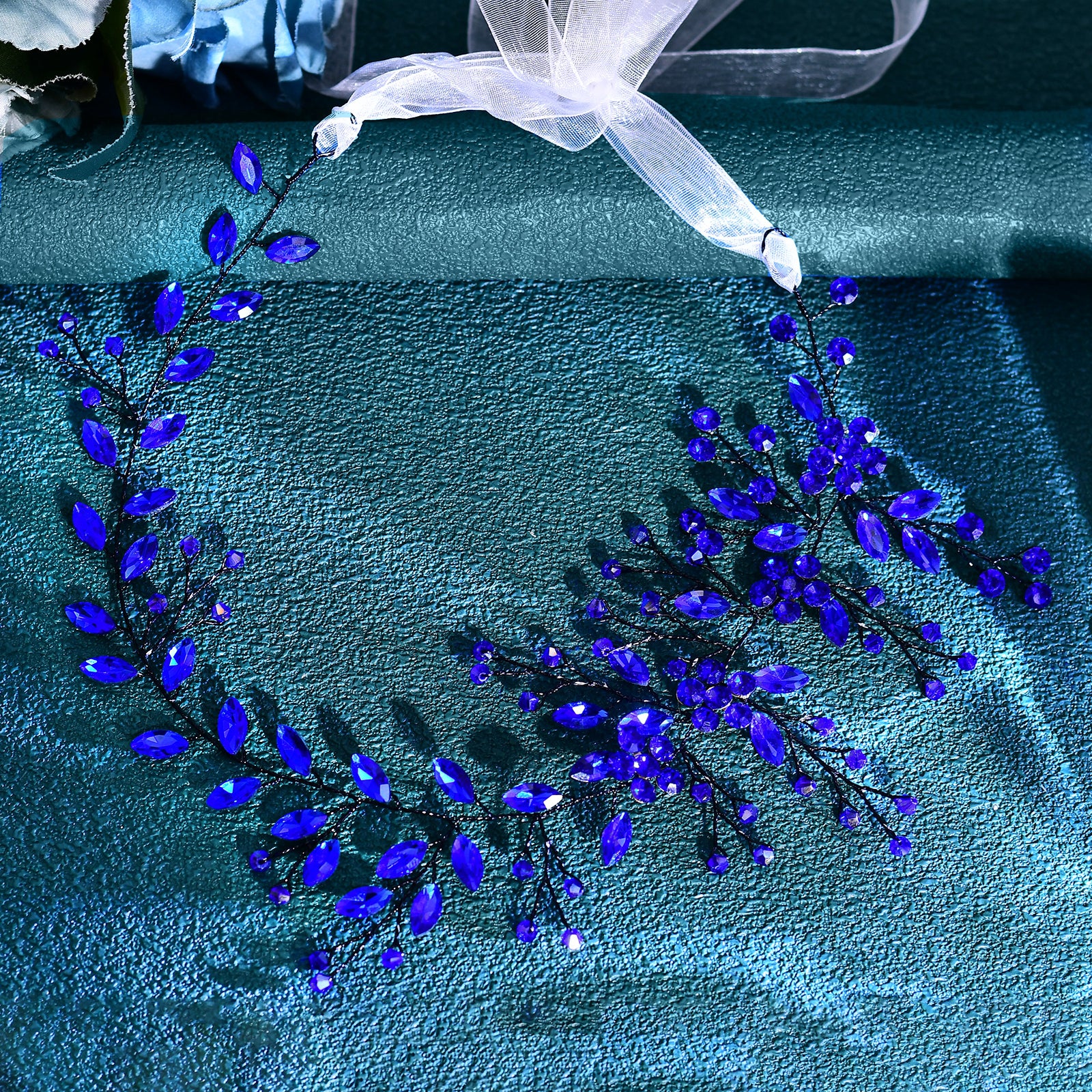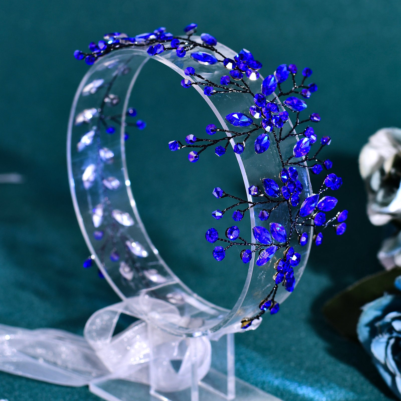 BRIDELLA BHP65 Royal Blue Handmade Rhinestone Woman Headband Bride Wedding Hair Accessories Head Jewelry Bridal Headpieces with Organza