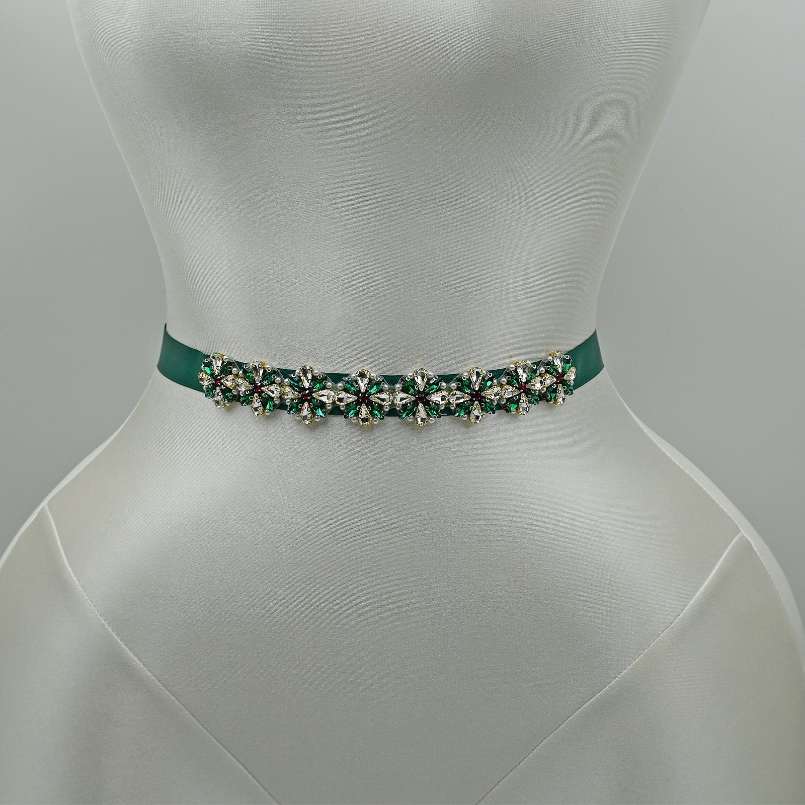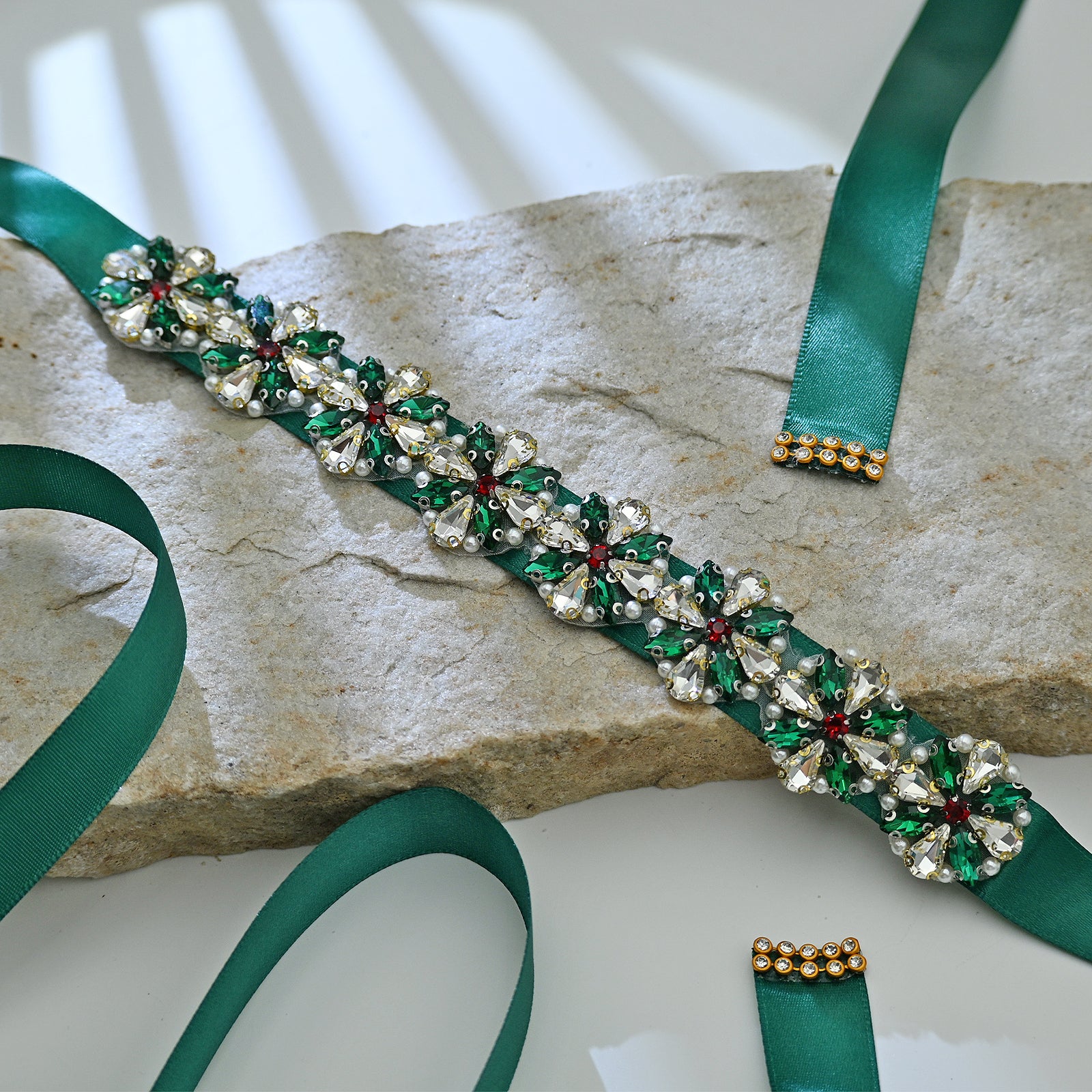 Bridella BS205-Green Ribbon Rhinestone & Pearl Belt