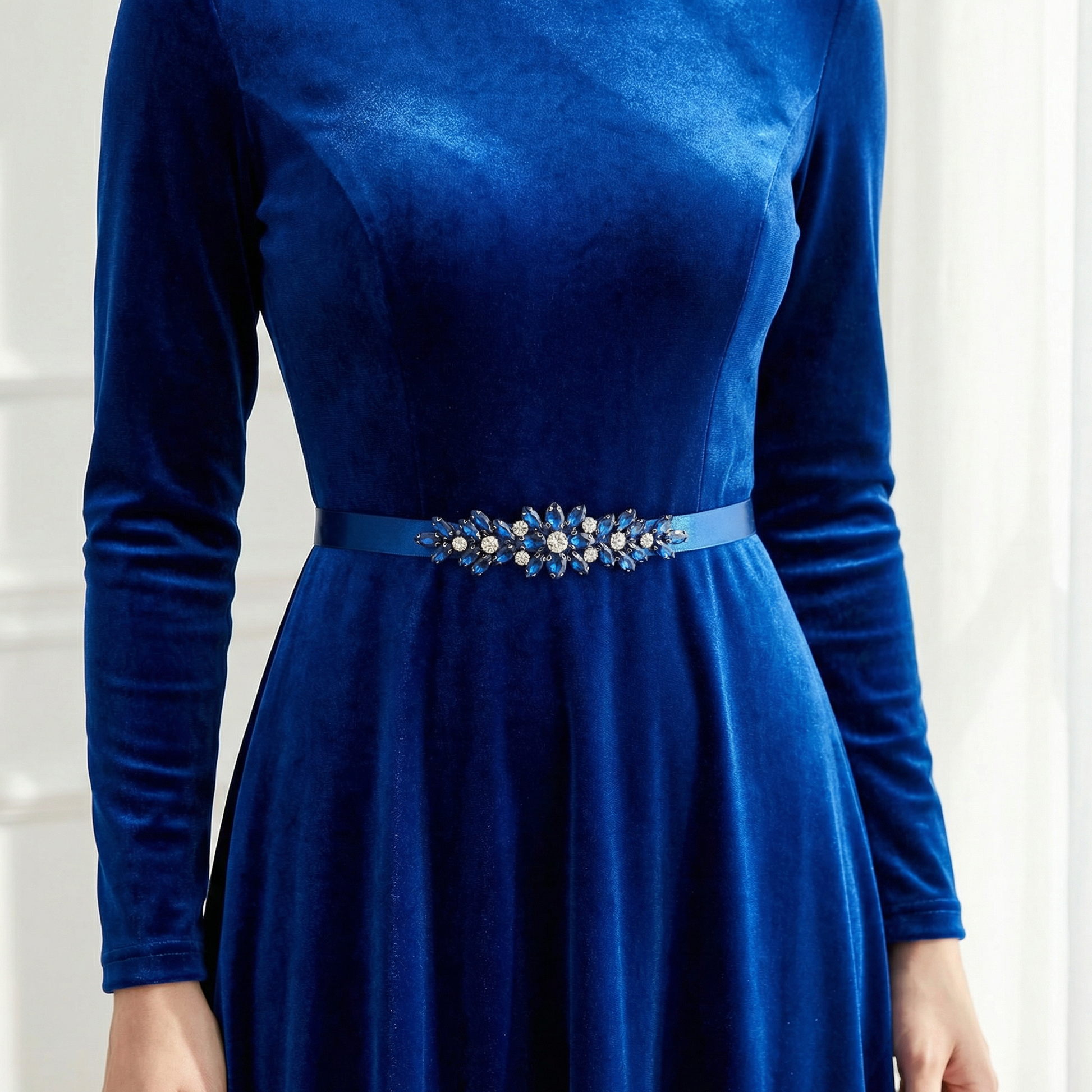 Add a rich and elegant sparkle to your bridal or formal look with this navy blue rhinestone bridal sash. Designed with a refined floral-inspired rhinestone pattern and finished with a matching ribbon tie, it highlights the waistline beautifully while offering an adjustable and comfortable fit for weddings and special occasions.