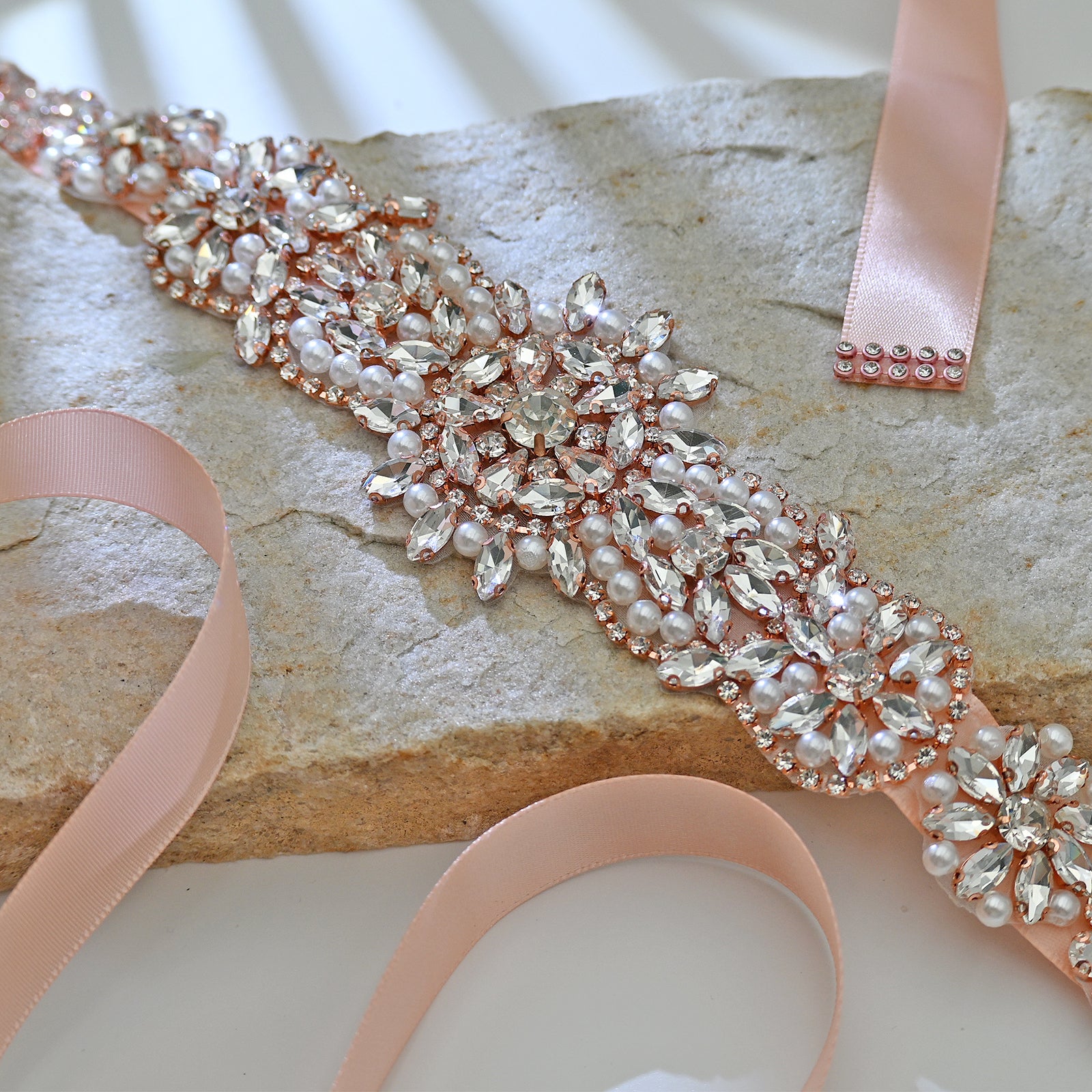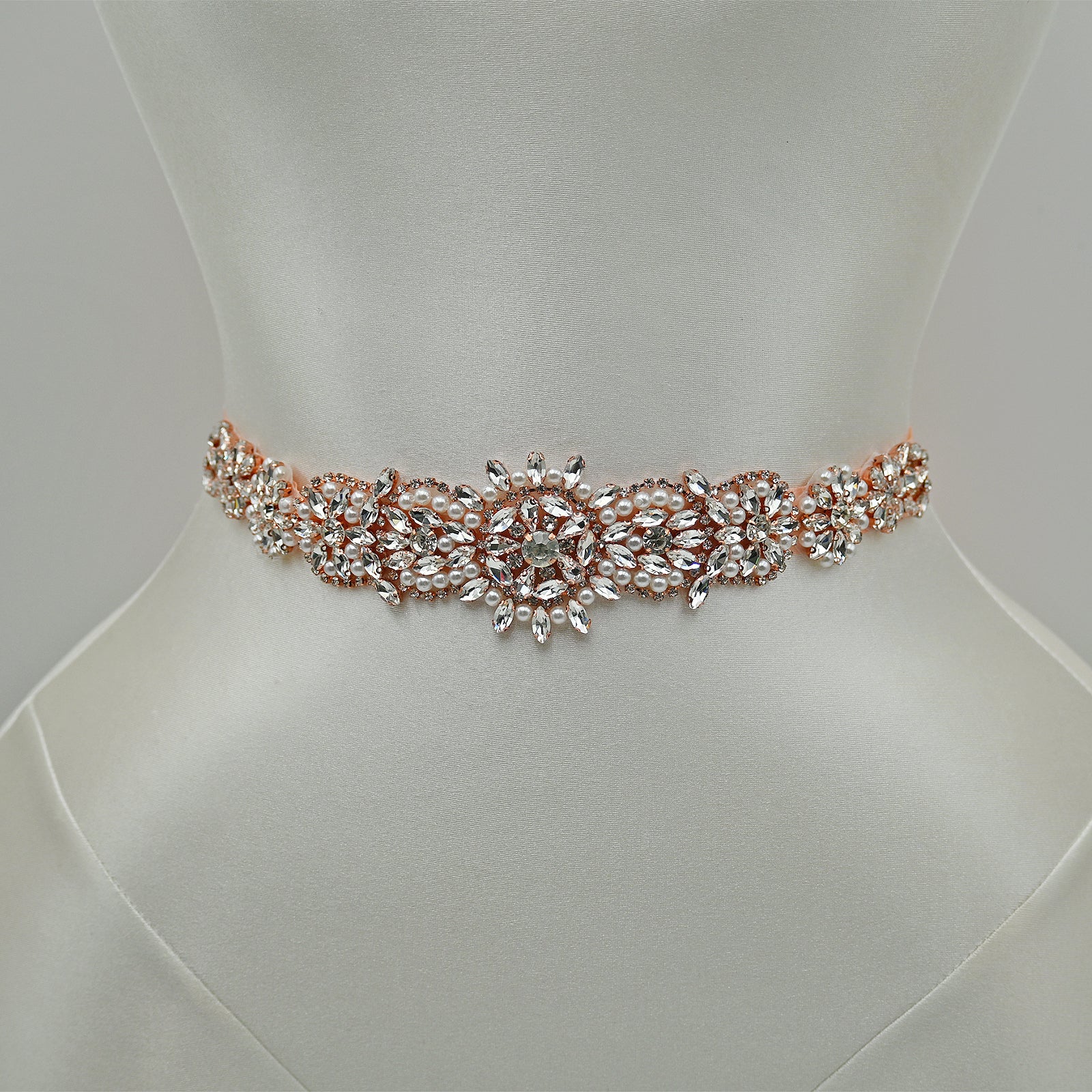 Elevate your look with this rose gold rhinestone and pearl belt, perfect for weddings, proms, and special occasions.