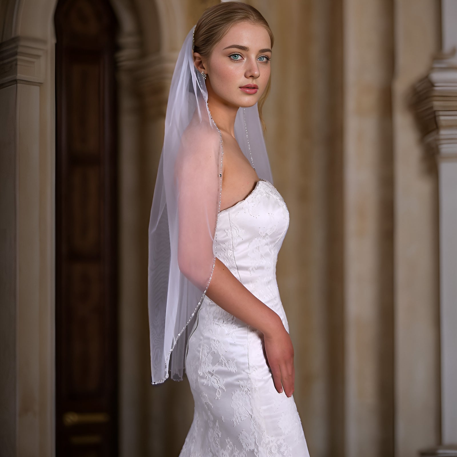 BRIDELLA BV31 Thin Transparent Fingertip Length Bridal Wedding Tulle With Handmade Beaded Edge Decoration Simple And Elegant