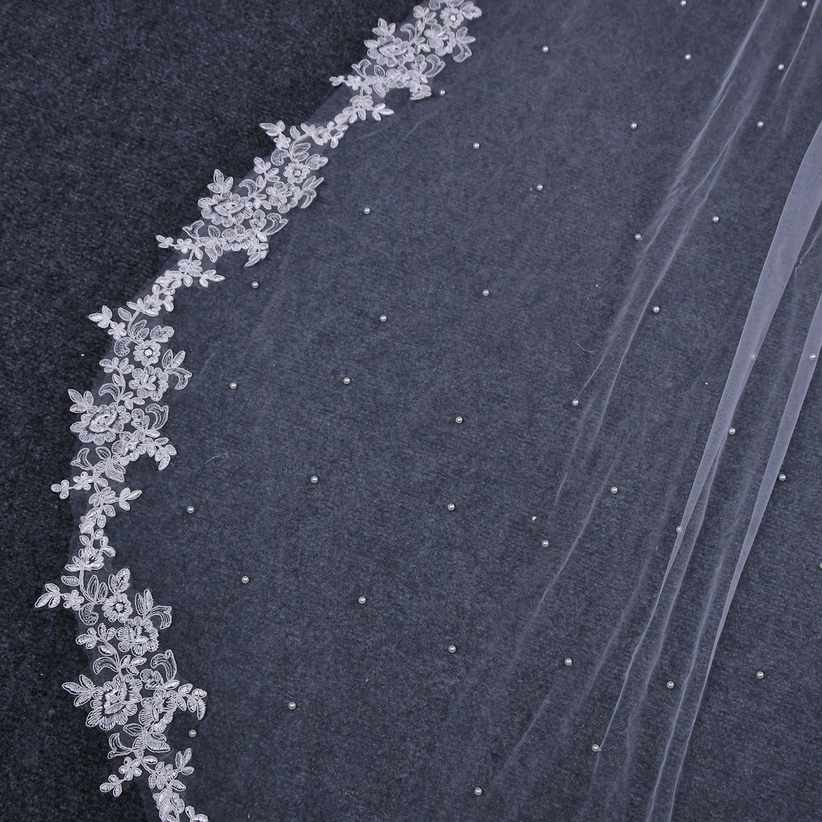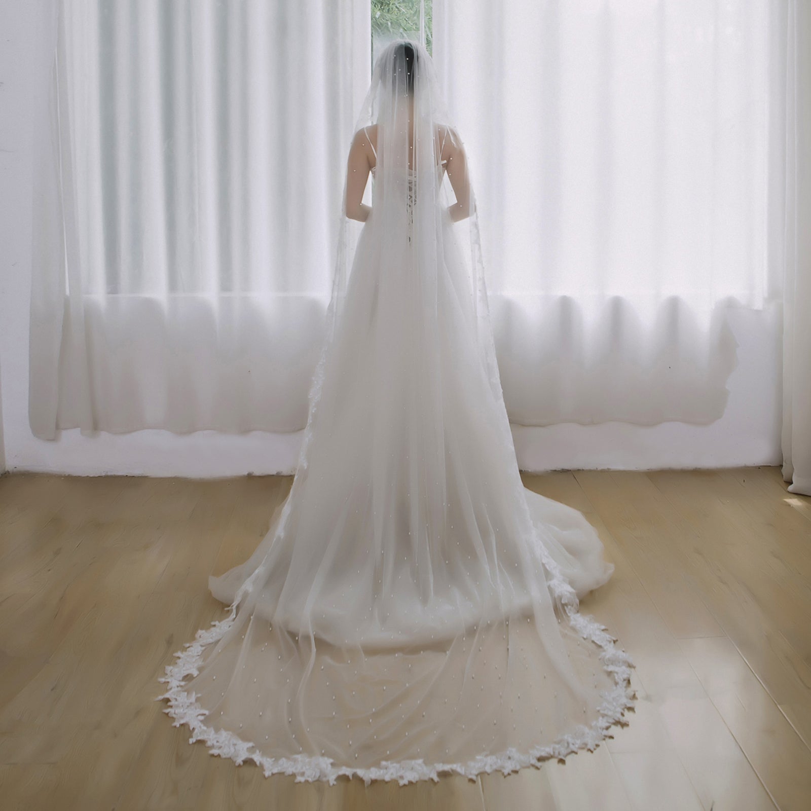 BRIDELLA BV82 Fashion Bridal Wedding Lace Veil Single Layer Cathedral Train Elegant Combed Pearl Tulle
