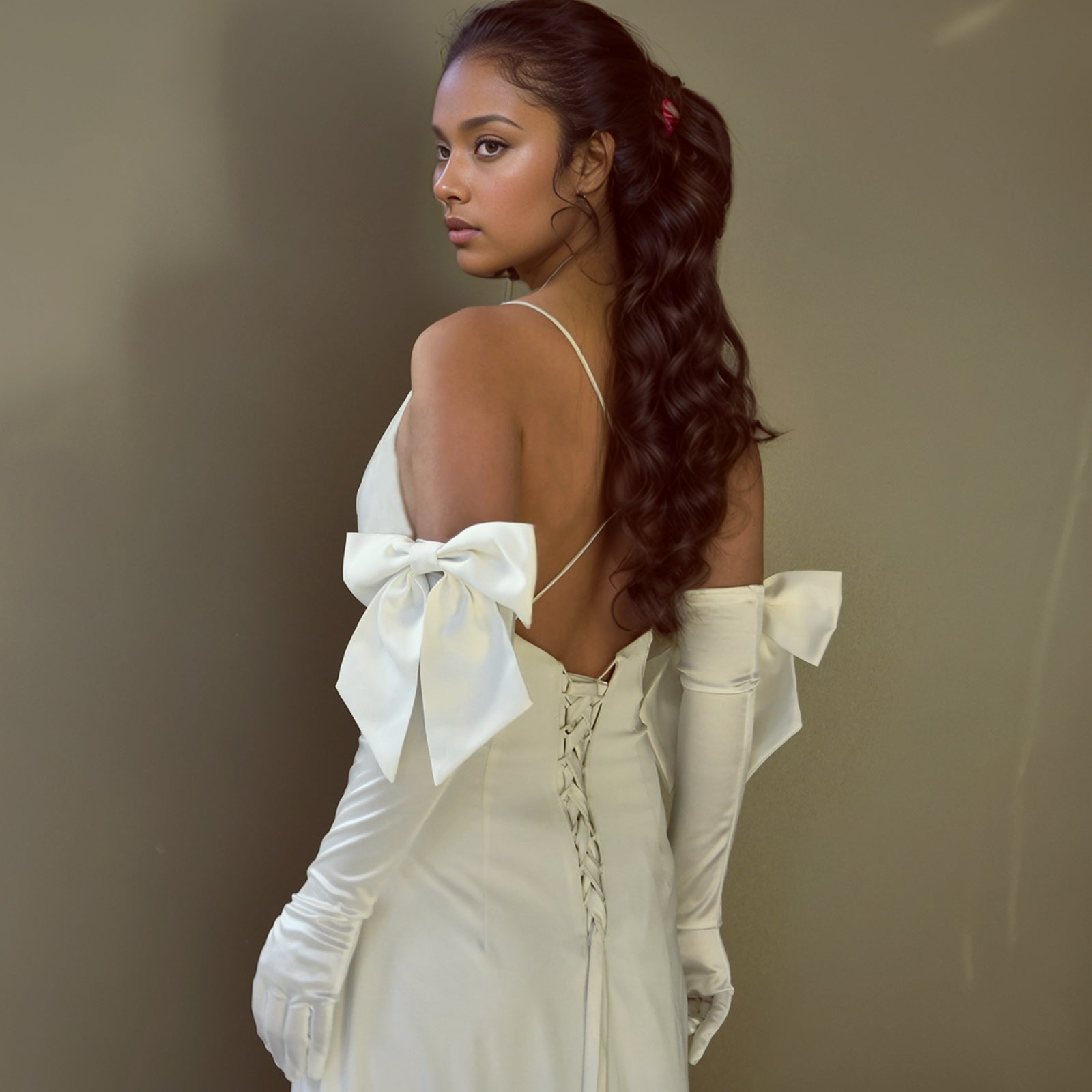 BRIDELLA BVM42 White Satin Five Finger Gloves With Bow Decoration Suitable For Bridal Wedding Ceremony Gloves
