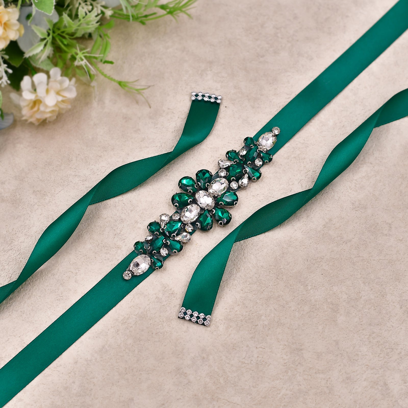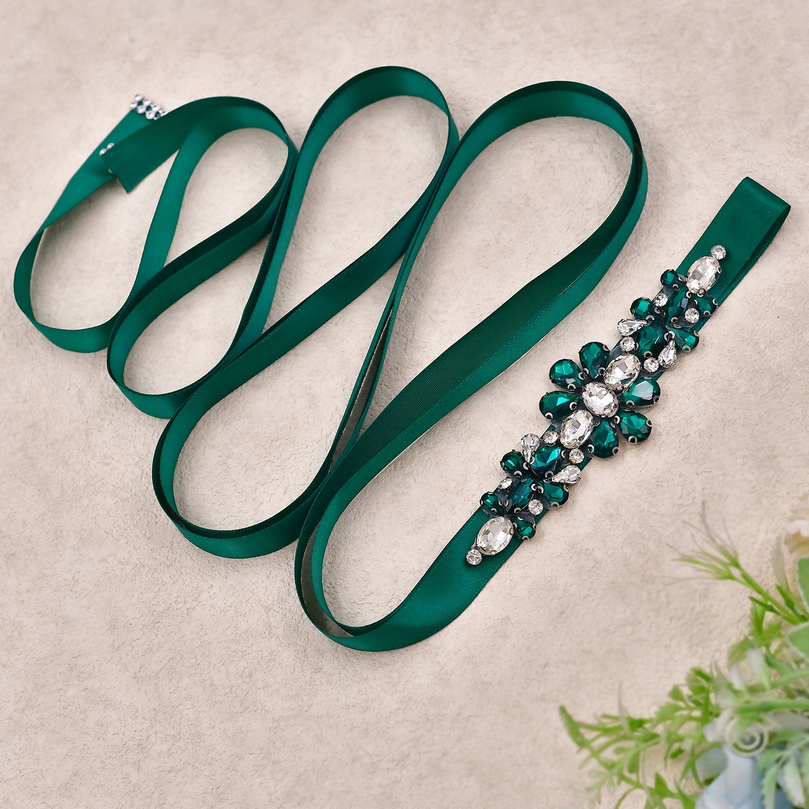 BRIDELLA BS45KL Christmas Style Waist Decoration With Dark Green Rhinestone Flower Strap Belt