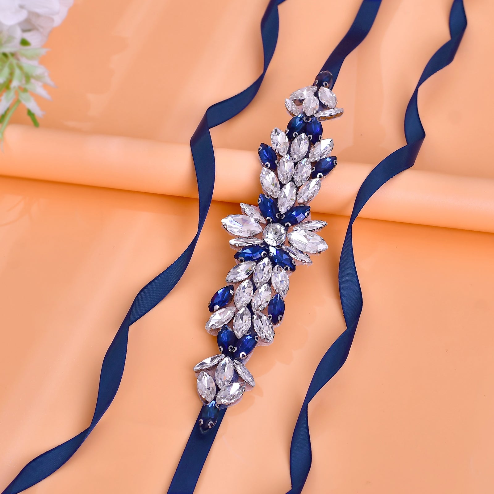BRIDELLA BS227ML Elegant Womens Satin Belt Ink Blue Diamond High-End Dress Accessories