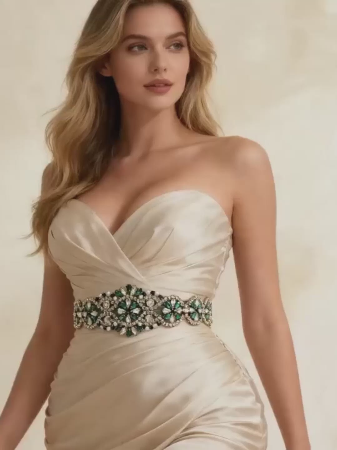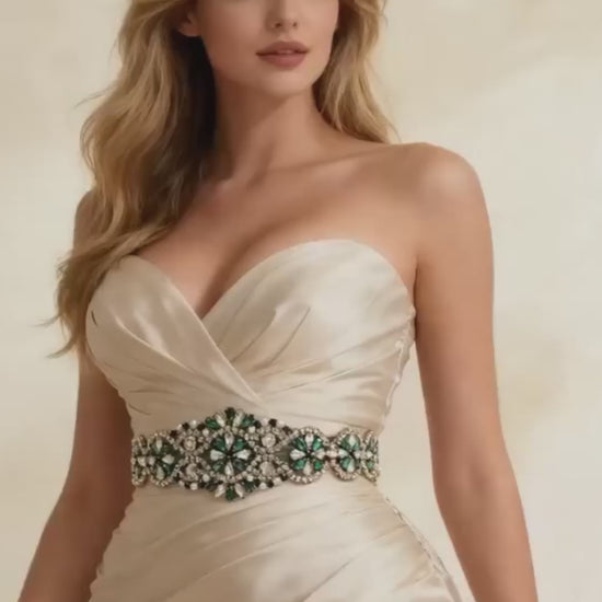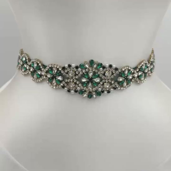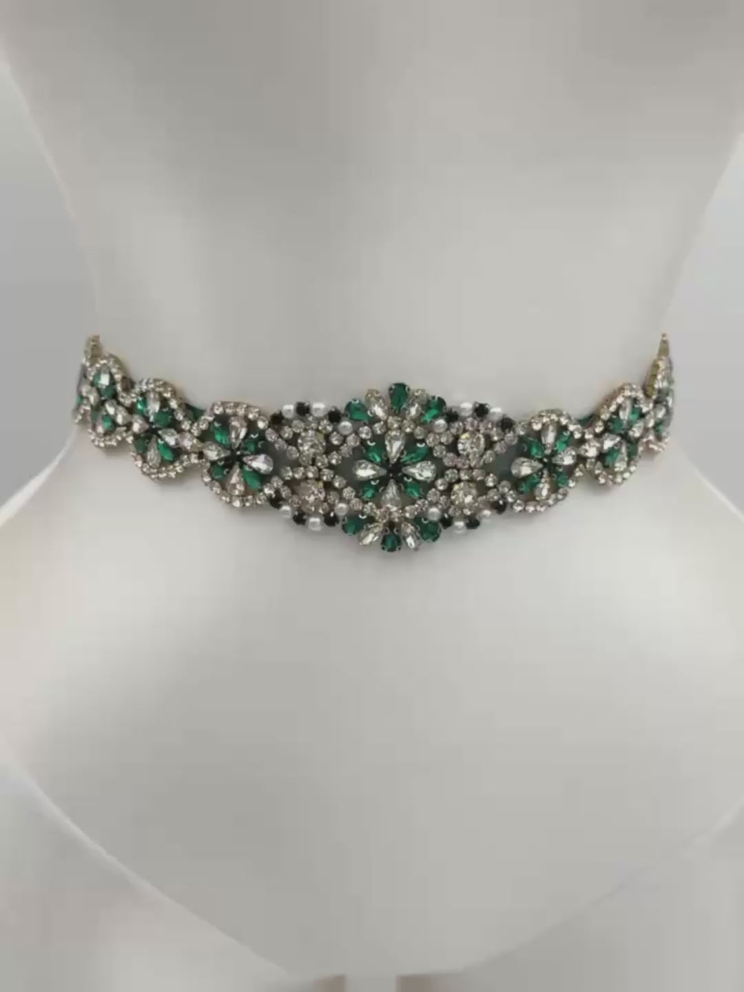 Elevate your look with this emerald rhinestone and pearl belt, perfect for weddings, proms, and special occasions.