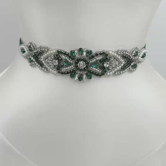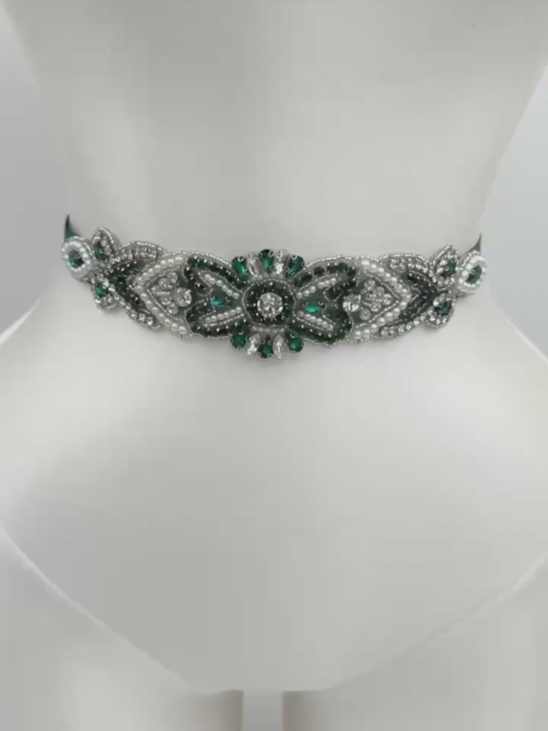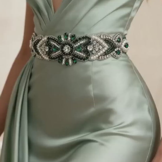 Elevate your look with this emerald rhinestone and pearl belt, perfect for weddings, proms, and special occasions.