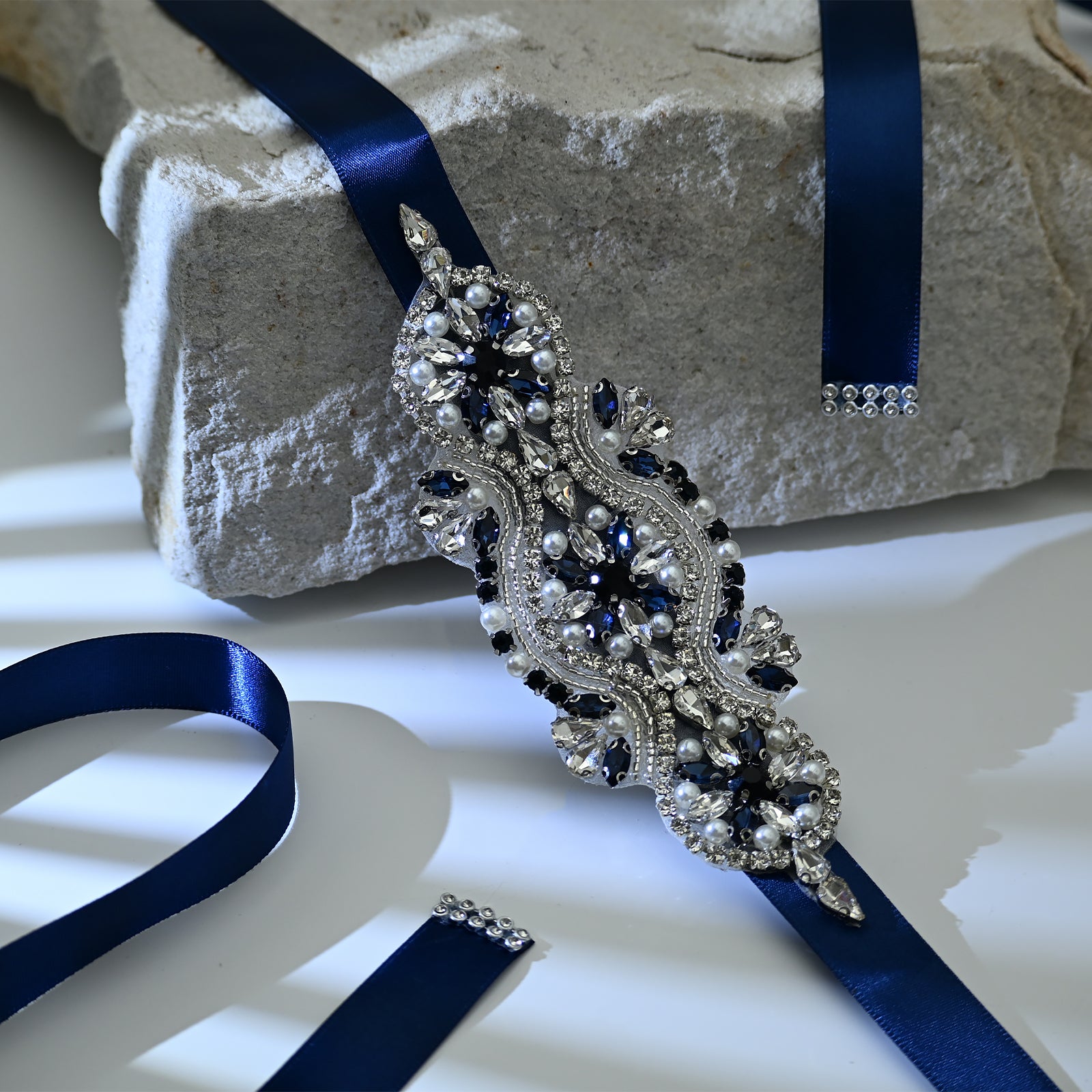 Elevate your look with this navy rhinestone and pearl belt, perfect for weddings, proms, and special occasions.