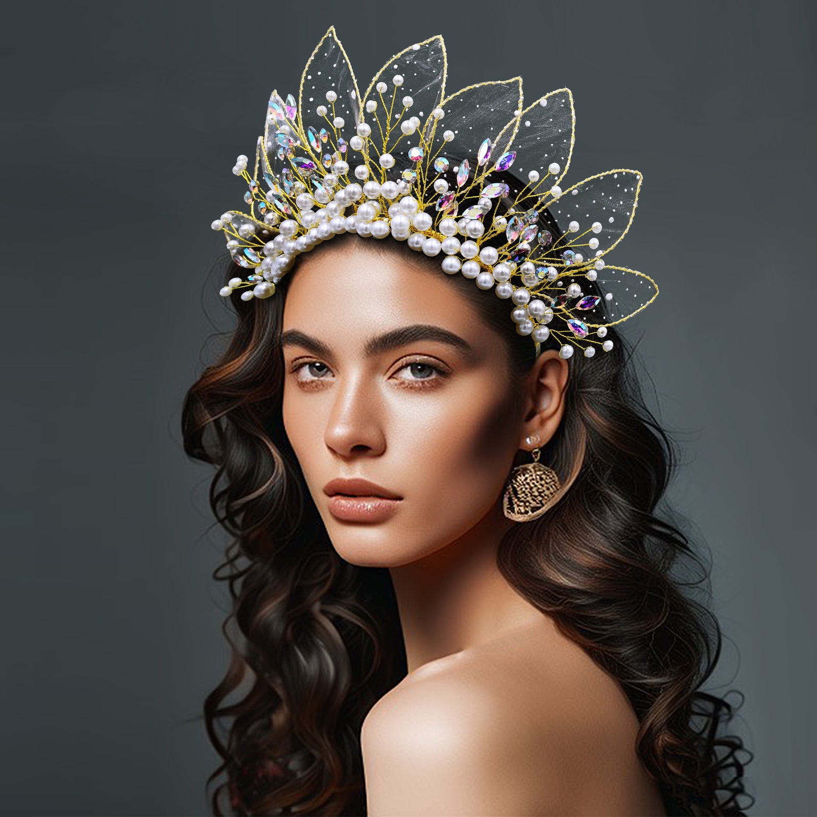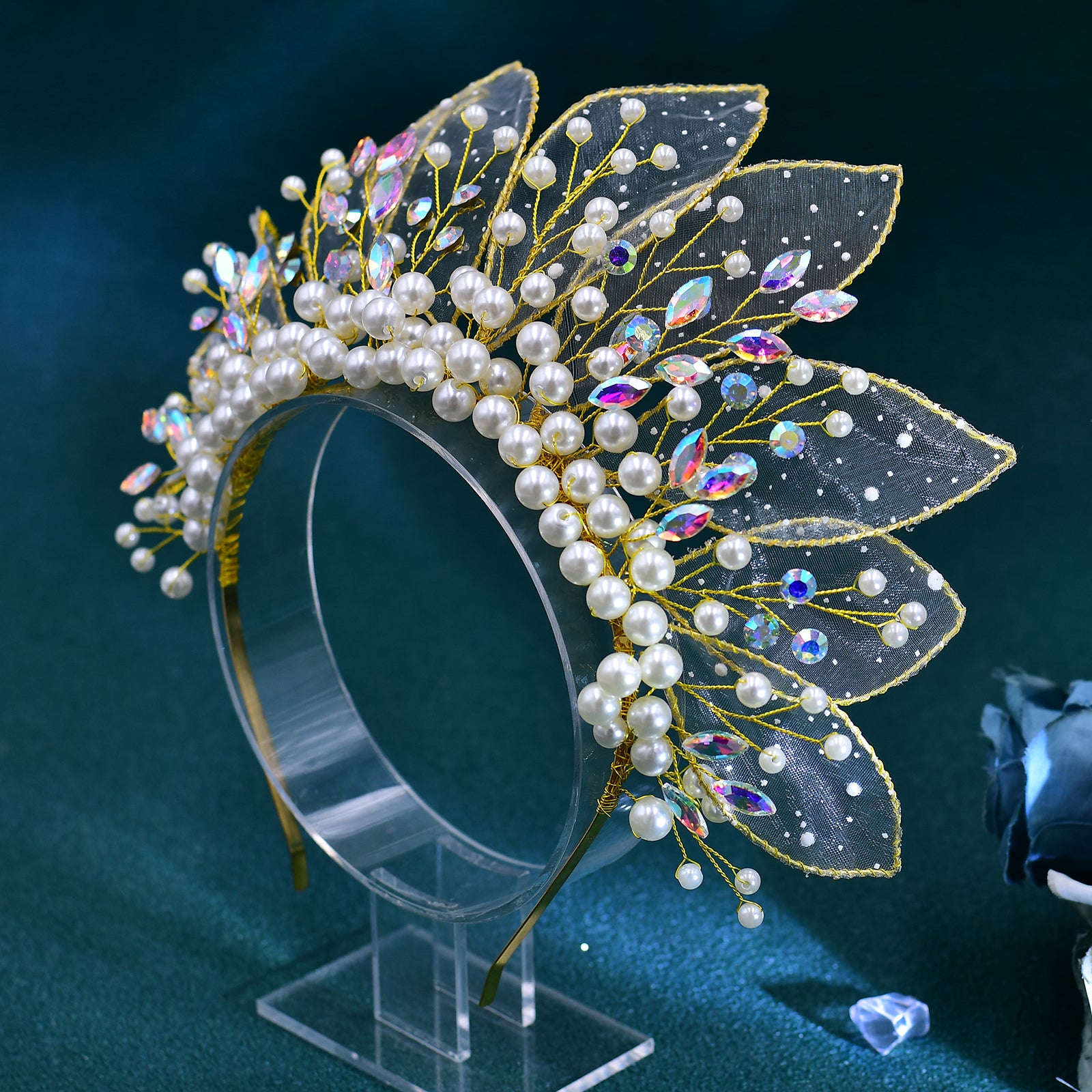 BRIDELLA BHP670 Handmade Gold Color Leaf And Pearl Crown Headband Wedding Crown for Bride Hair Accessories Bridesmaid Party Tiara