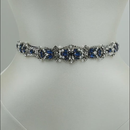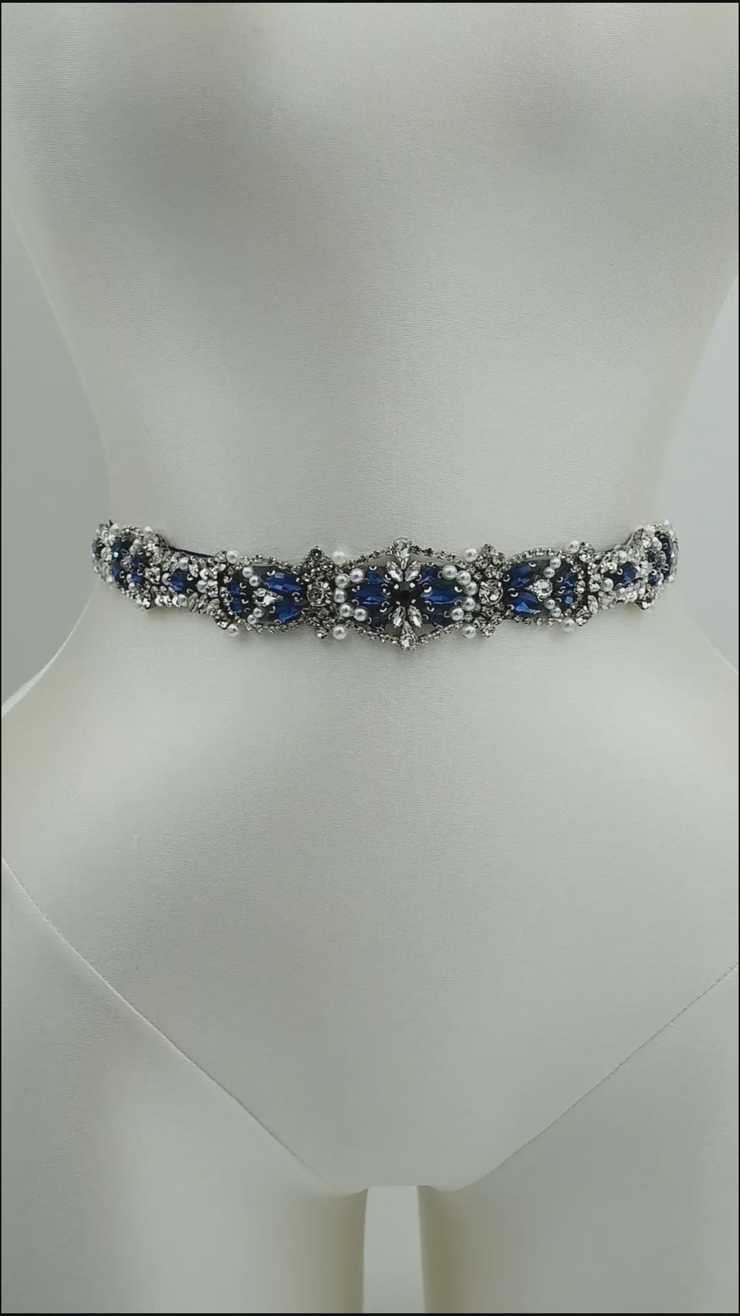 Elevate your look with this navy rhinestone and pearl belt, perfect for weddings, proms, and special occasions.