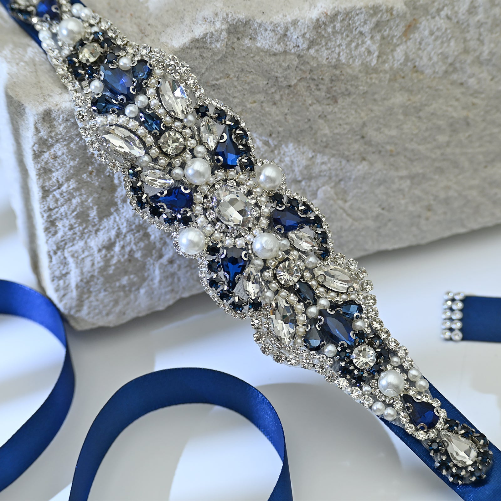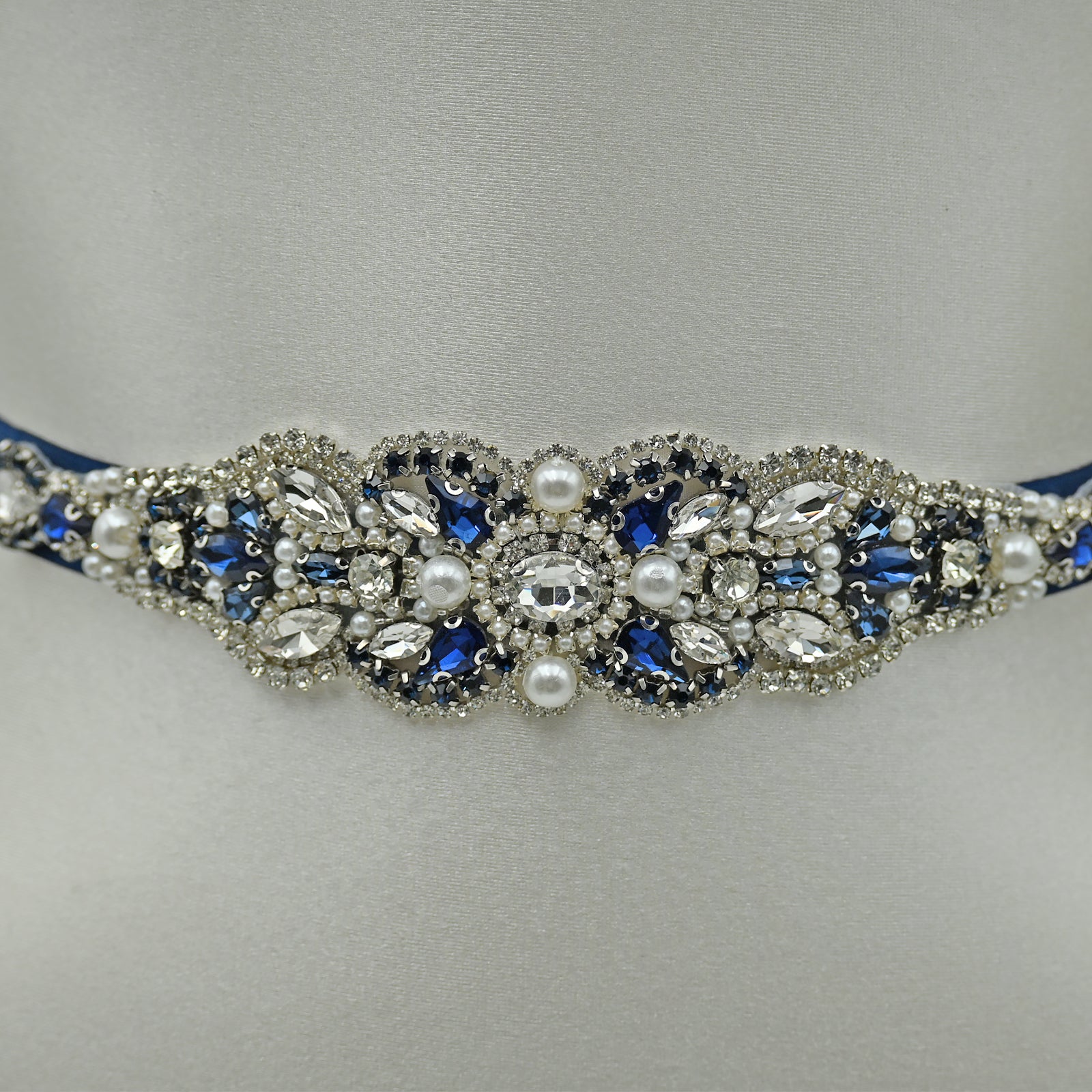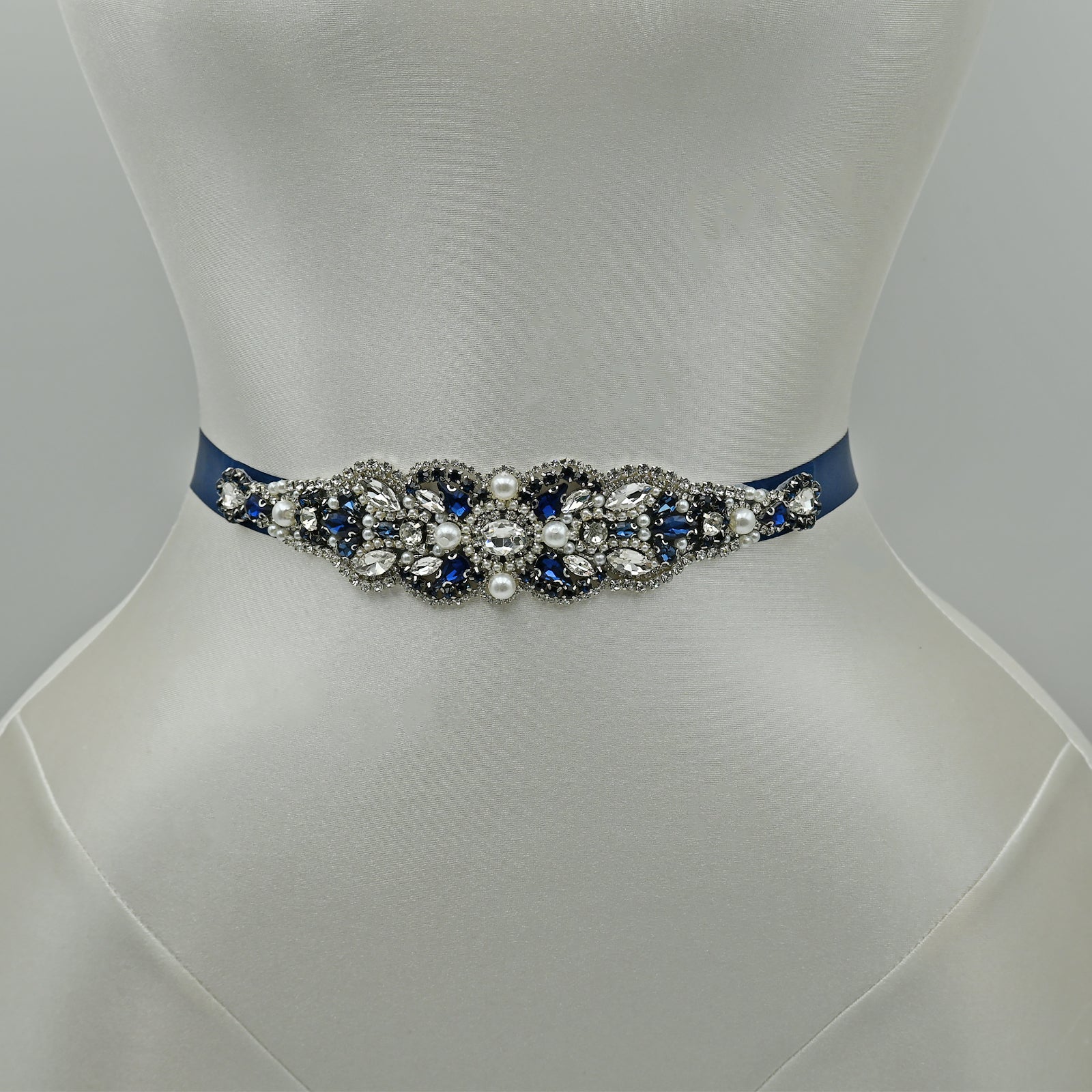 Elevate your look with this navy rhinestone and pearl belt, perfect for weddings, proms, and special occasions.