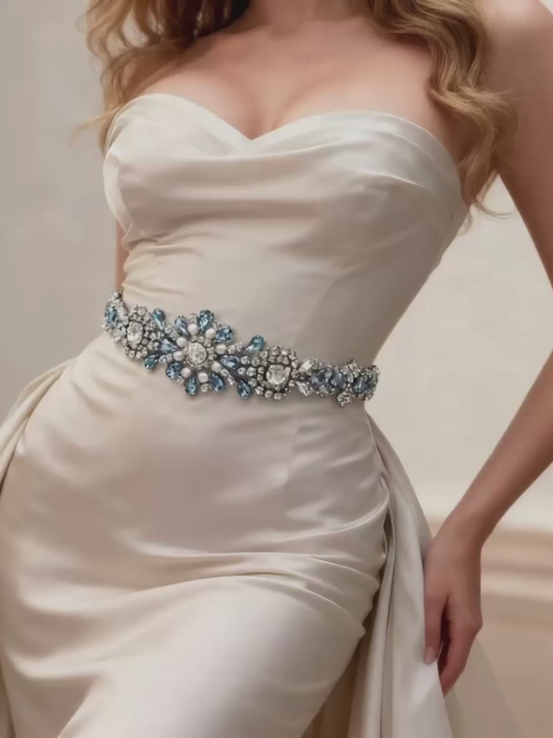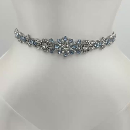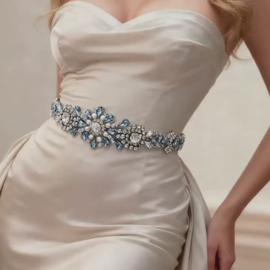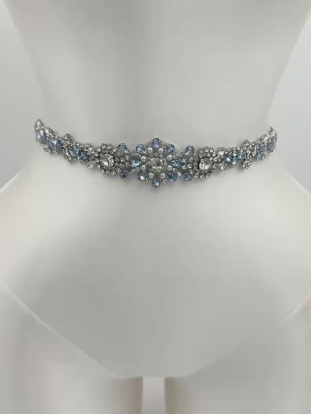 Elevate your look with this light blue rhinestone and pearl belt, perfect for weddings, proms, and special occasions.