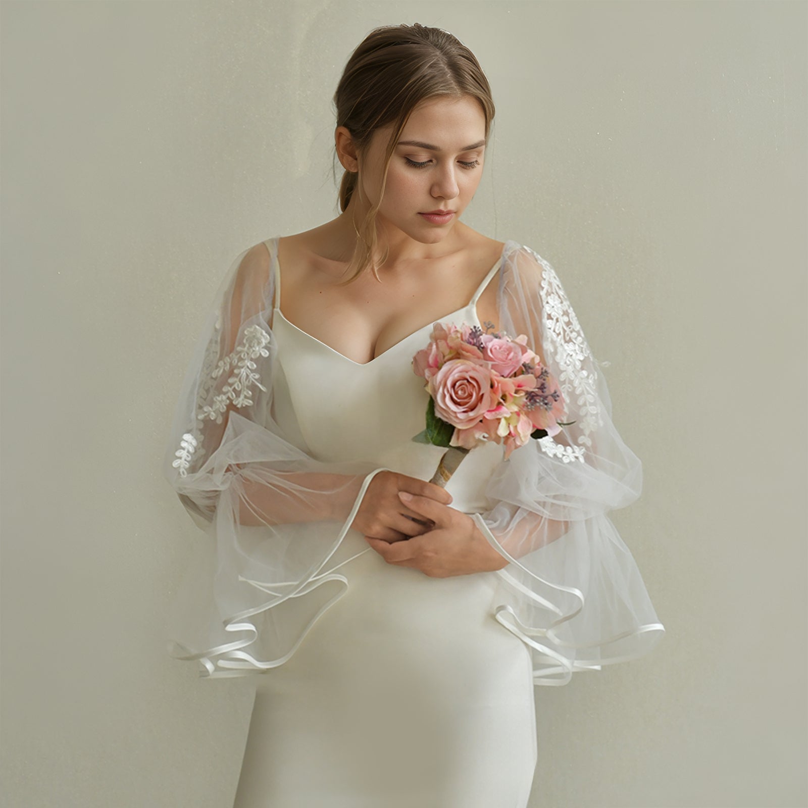 BRIDELLA BMM45 Long White Ribbon-Trimmed Fingerless Embroidered Bridal Sleeves Wedding Accessories Detachable Sleeves For Woman