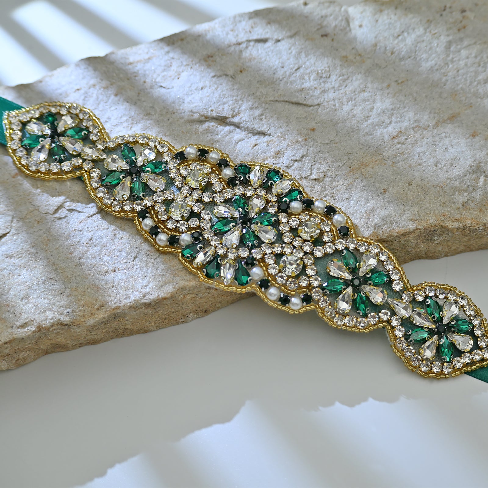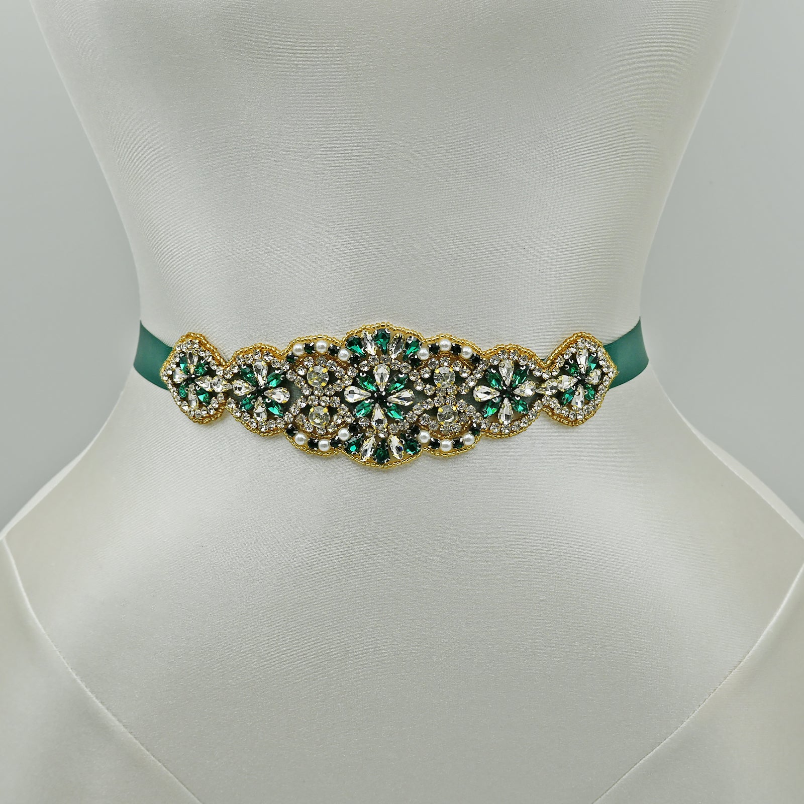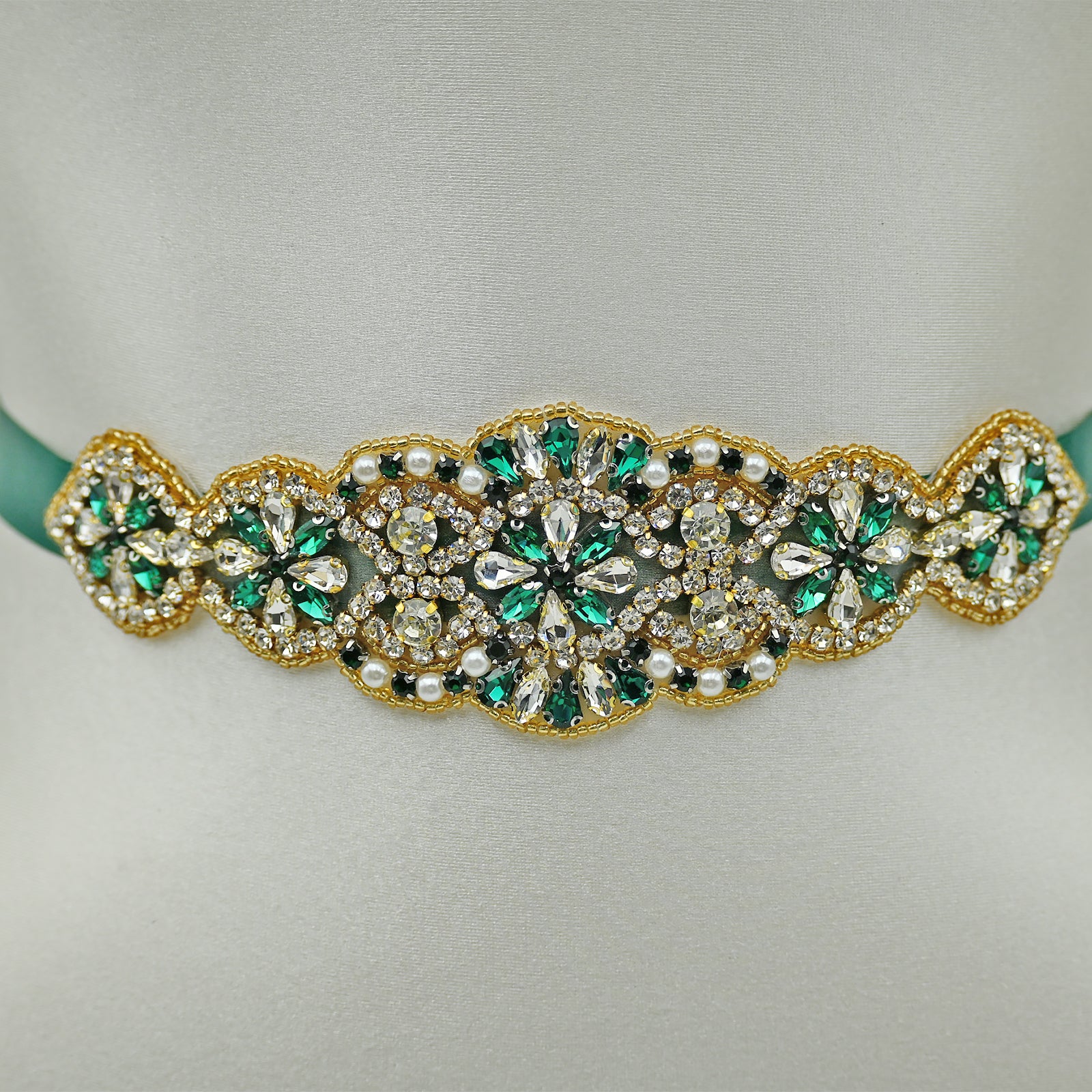 Elevate your look with this green rhinestone and pearl belt, perfect for weddings, proms, and special occasions.