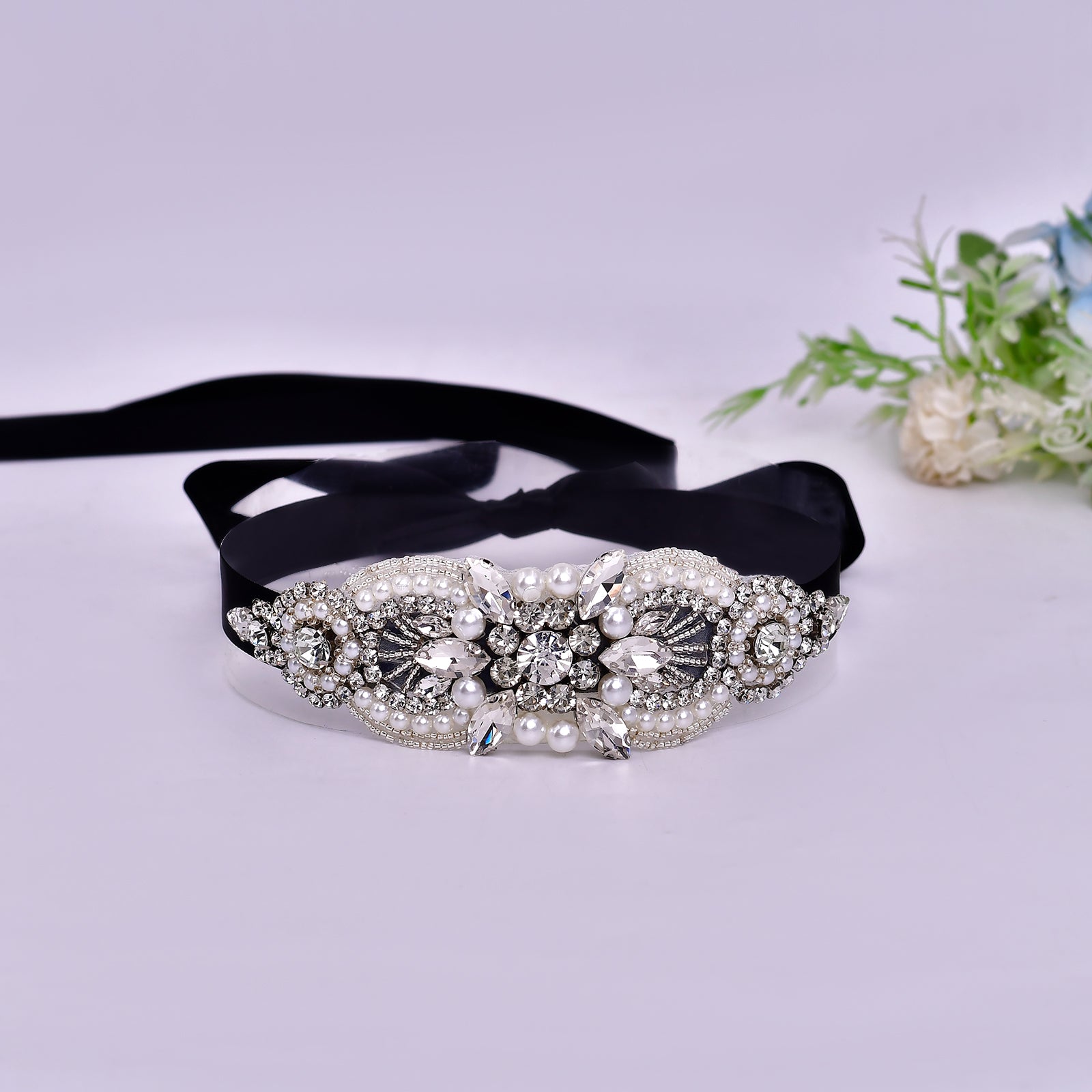 BRIDELLA BS159 Vintage High-End Crystal Studded Diamond Black Satin Ribbon Womens Belt